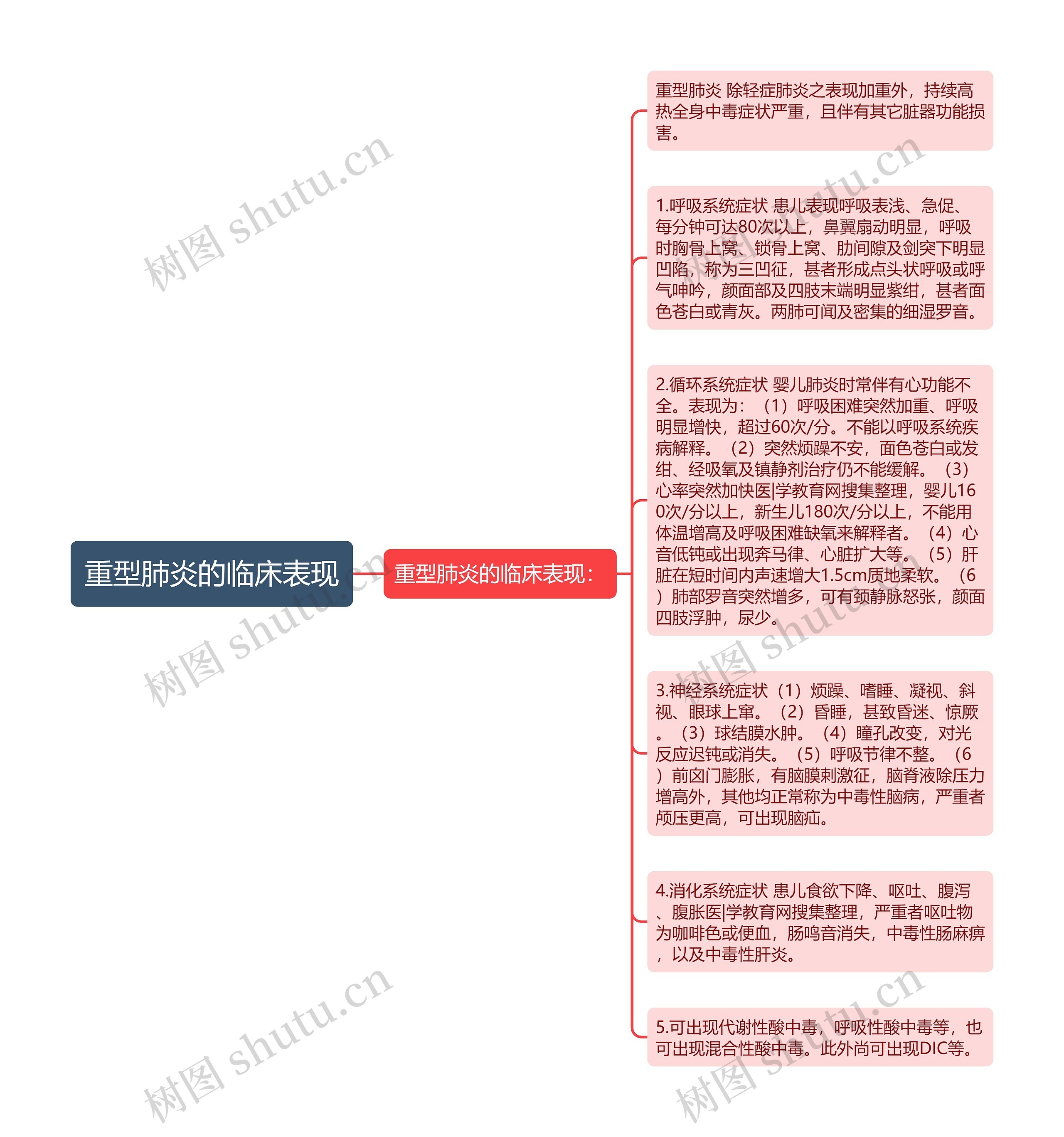 重型肺炎 除轻症肺炎之表现加重外,持续高热全身中毒症状严重,且伴有其它脏器功能损害。
