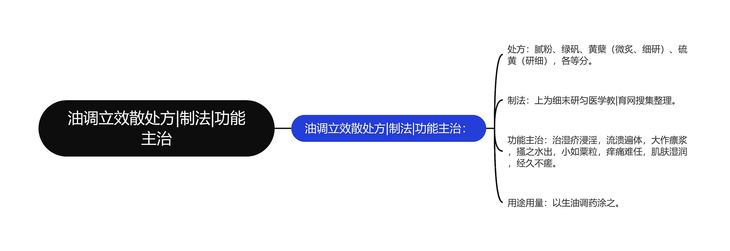 树图思维导图提供《油调立效散处方|制法|功能主治》在线思维导图免费制作,点击“编辑”按钮,可对《油调立效散处方|制法|功能主治》进行在线思维导图编辑,本思维导图属于思维导图模板主题,文件编号是:922b3396aa272bf7043d552941436954