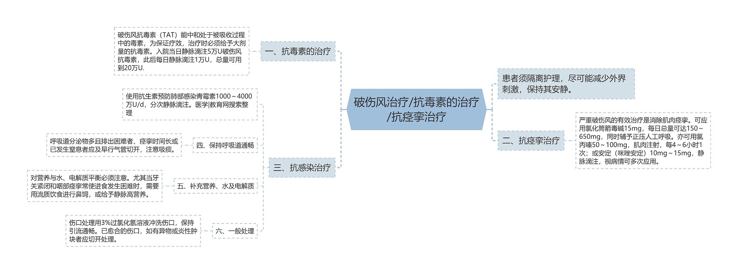 患者须隔离护理,尽可能减少外界刺激,保持其安静。 一、抗毒素的治疗 破伤风抗毒素(TAT)能中和处于被吸收过程中的毒素,为保证疗效,治疗时必须给予大剂量的抗毒素。入院当日静脉滴注5万U破伤风抗毒素,此后每日静脉滴注1万U,总量可用到20万U. 二、抗痉挛治疗 严重破伤风的有效治疗是消除肌肉痉挛。