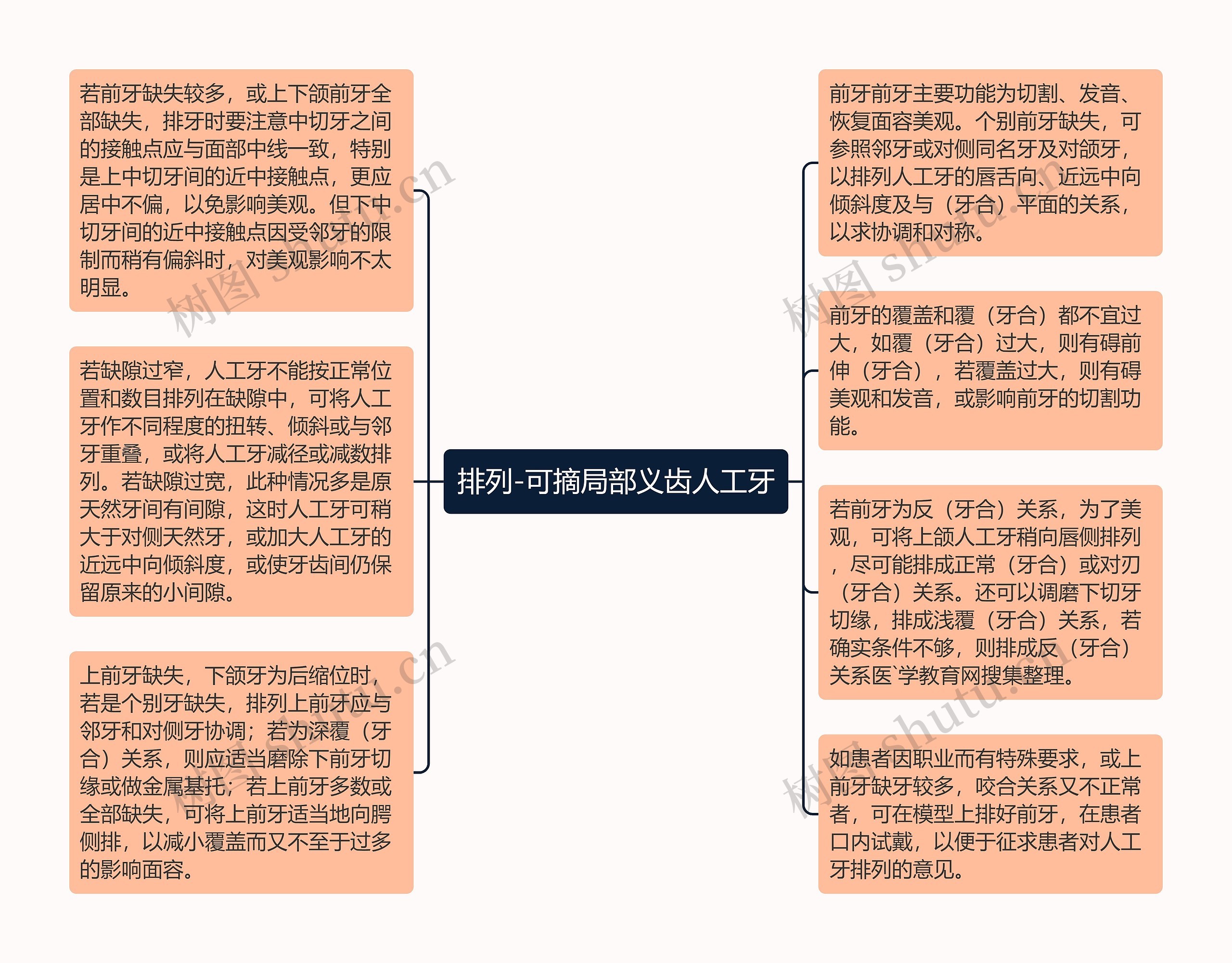 前牙前牙主要功能为切割、发音、恢复面容美观。个别前牙缺失,可参照邻牙或对侧同名牙及对颌牙,以排列人工牙的唇舌向、近远中向倾斜度及与(牙合)平面的关系,以求协调和对称。
