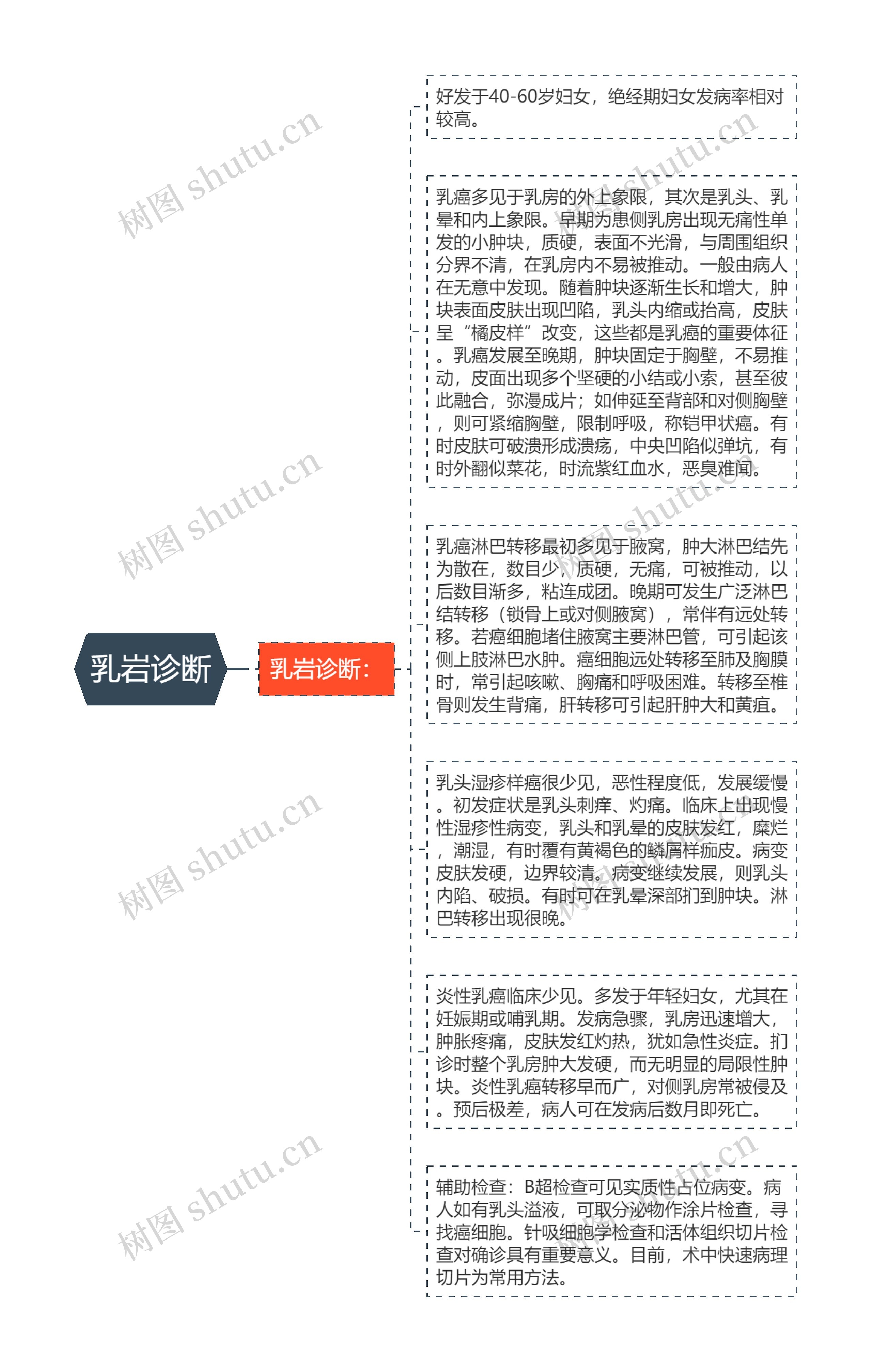 辅助检查:B超检查可见实质性占位病变。病人如有乳头溢液,可取分泌物作涂片检查,寻找癌细胞。针吸细胞学检查和活体组织切片检查对确诊具有重要意义。目前,术中快速病理切片为常用方法。