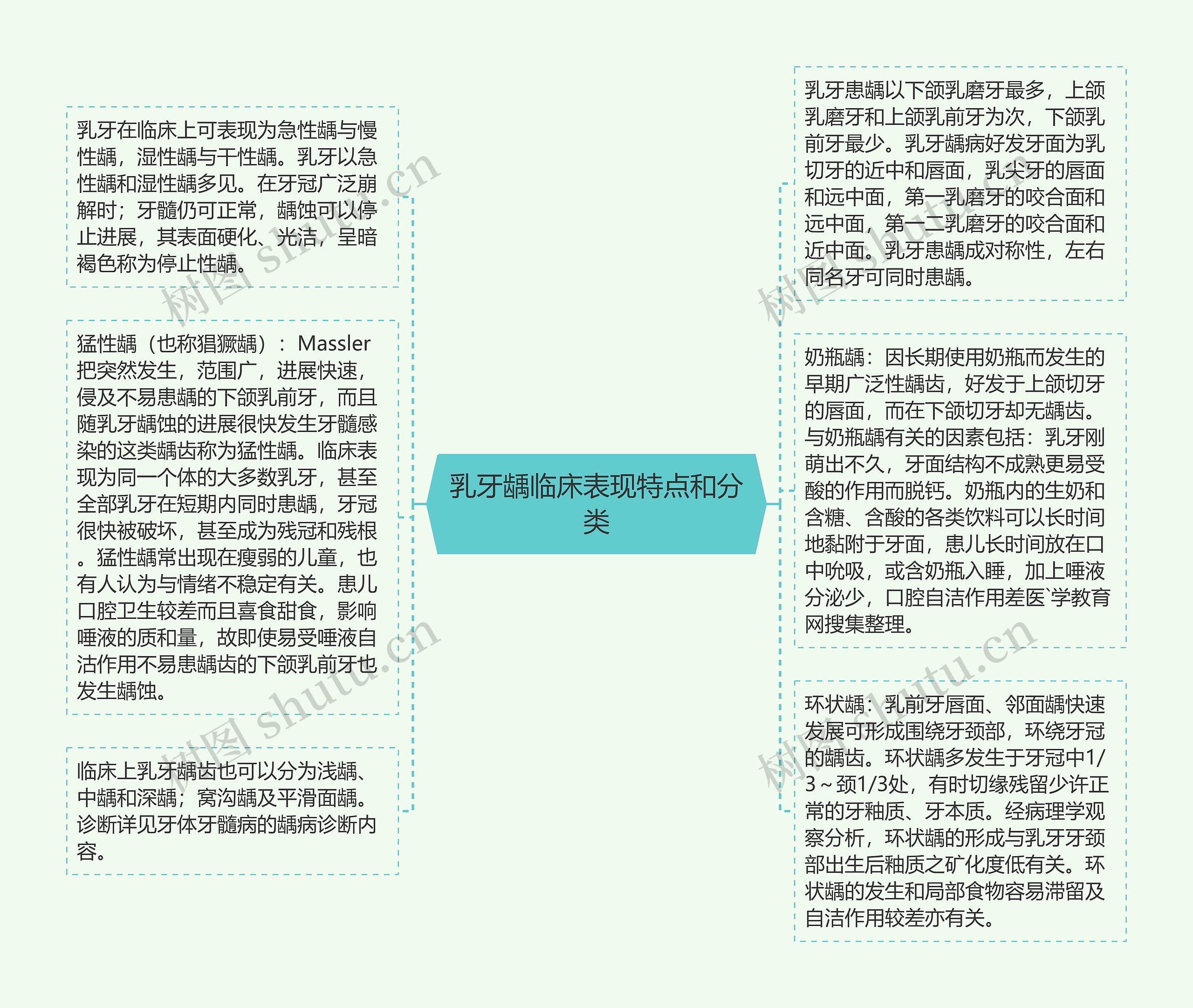 临床上乳牙龋齿也可以分为浅龋、中龋和深龋;窝沟龋及平滑面龋。诊断详见牙体牙髓病的龋病诊断内容。
