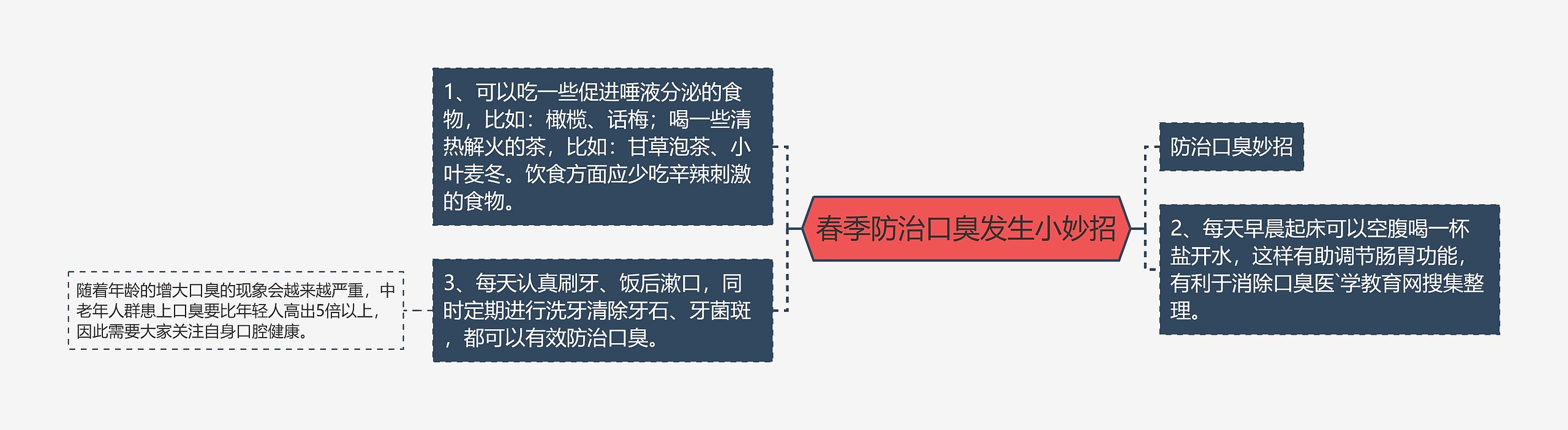 树图思维导图提供《春季防治口臭发生小妙招》在线思维导图免费制作,点击“编辑”按钮,可对《春季防治口臭发生小妙招》进行在线思维导图编辑,本思维导图属于思维导图模板主题,文件编号是:4bf57e5c48bbf8588148c5106e2fcacc