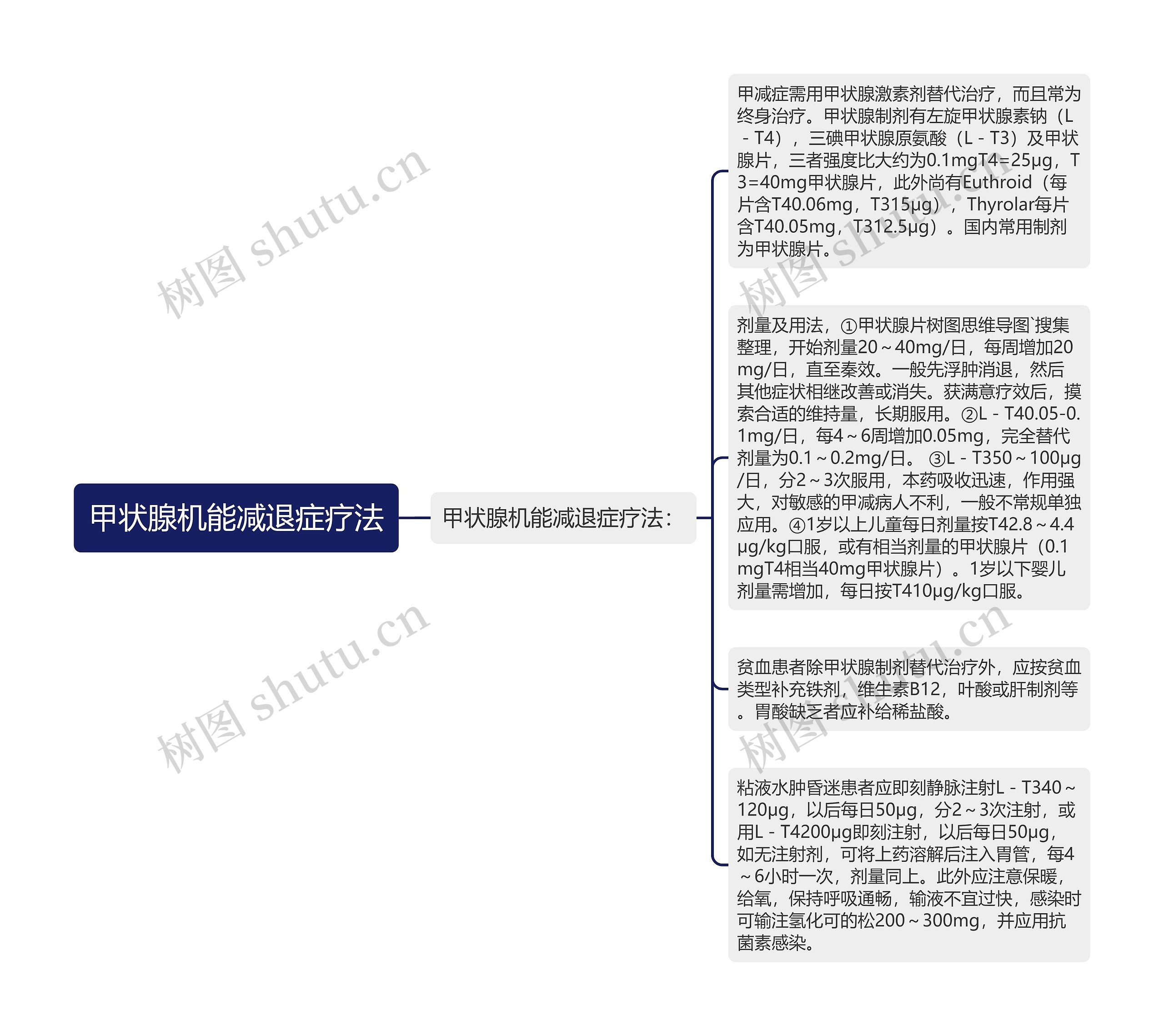 剂量及用法,①甲状腺片树图思维导图`搜集整理,开始剂量20~40mg/日,每周增加20mg/日,直至秦效。一般先浮肿消退,然后其他症状相继改善或消失。获满意疗效后,摸索合适的维持量,长期服用。②L-T40.05-0.1mg/日,每4~6周增加0.05mg,完全替代剂量为0.1~0.2mg/日。 ③L-T350~100μg/日,分2~3次服用,本药吸收迅速,作用强大,对敏感的甲减病人不利,一般不常规单独应用。④1岁以上儿童每日剂量按T42.8~4.4μg/kg口服,或有相当剂量的甲状腺片(0.1mgT4相当40mg甲状腺片)。1岁以下婴儿剂量需增加,每日按T410μg/kg口服。