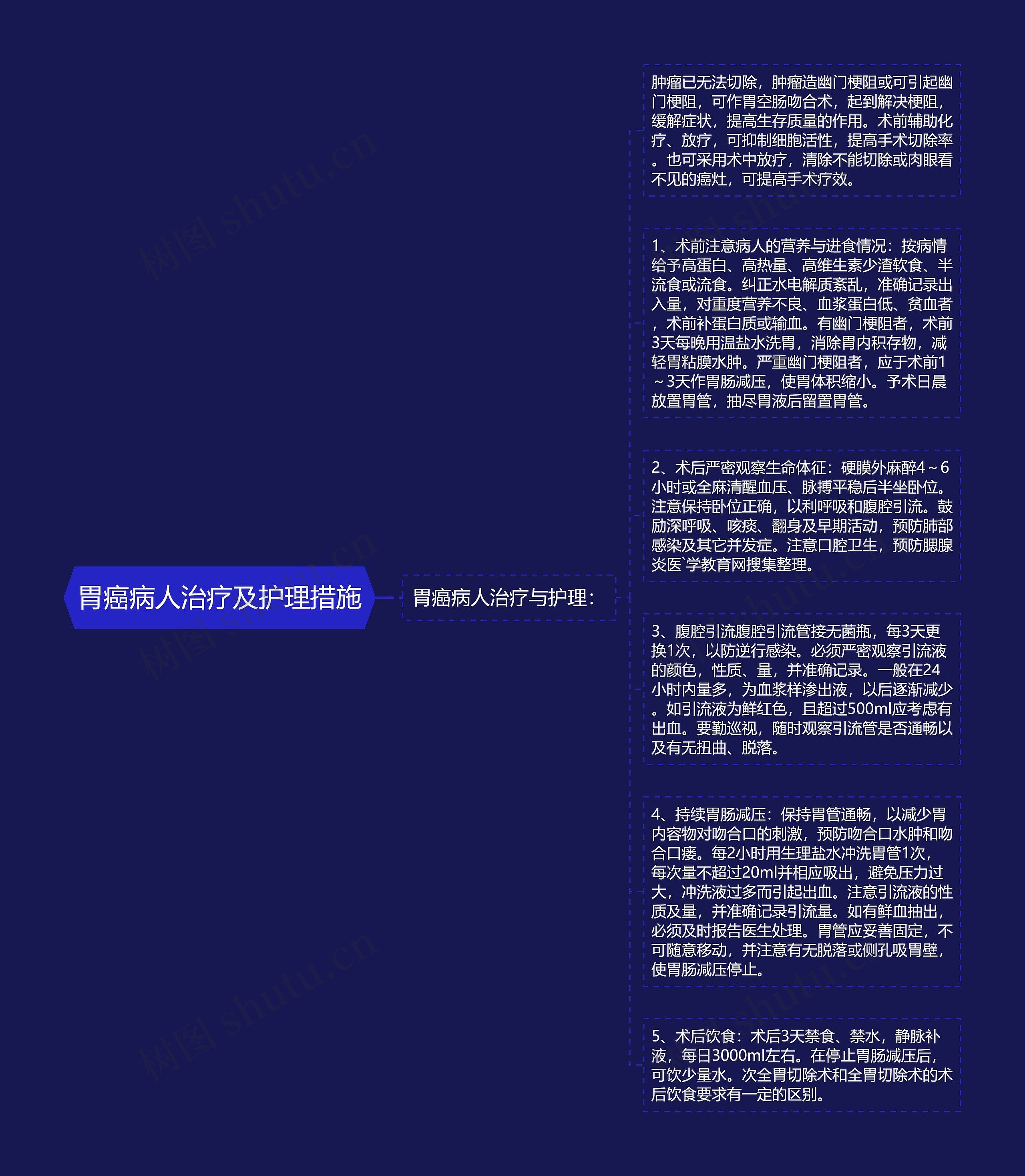 5、术后饮食:术后3天禁食、禁水,静脉补液,每日3000ml左右。在停止胃肠减压后,可饮少量水。次全胃切除术和全胃切除术的术后饮食要求有一定的区别。
