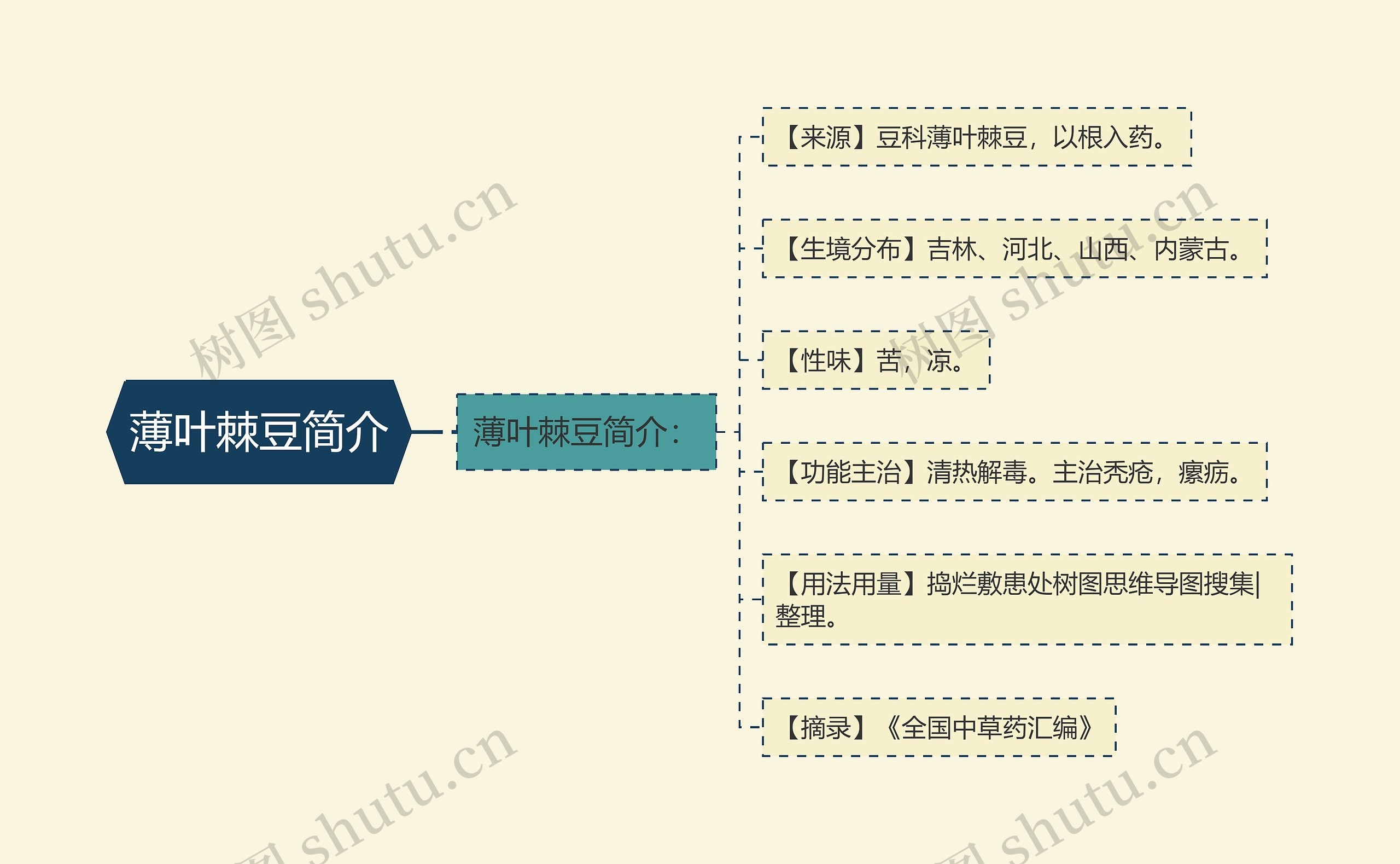 薄叶棘豆简介: 【来源】豆科薄叶棘豆,以根入药。 【生境分布】吉林、河北、山西、内蒙古。 【性味】苦,凉。 【功能主治】清热解毒。主治秃疮,瘰疬。 【用法用量】捣烂敷患处树图思维导图搜集|整理。