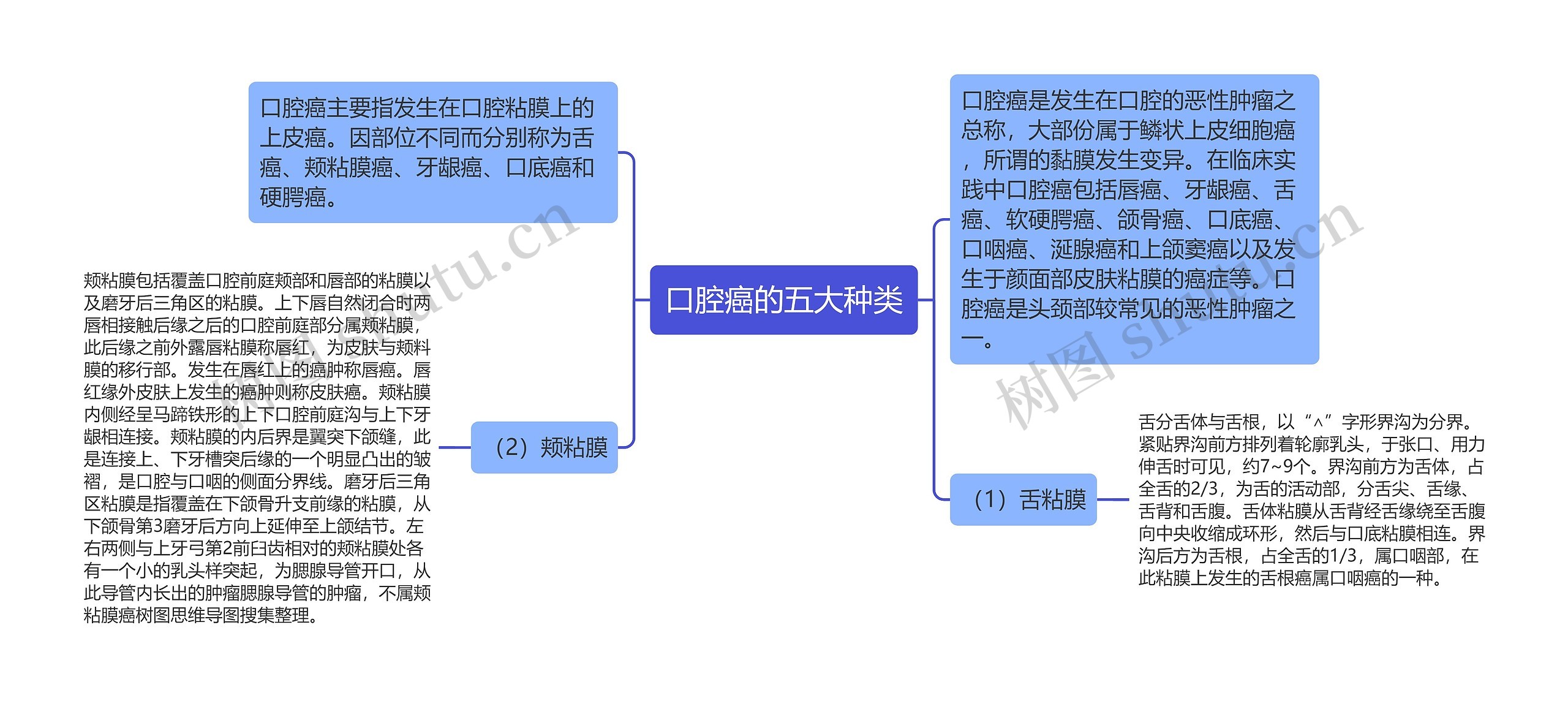 树图思维导图提供《口腔癌的五大种类》在线思维导图免费制作,点击“编辑”按钮,可对《口腔癌的五大种类》进行在线思维导图编辑,本思维导图属于思维导图模板主题,文件编号是:42fe25770513f90d74037f712f166a53