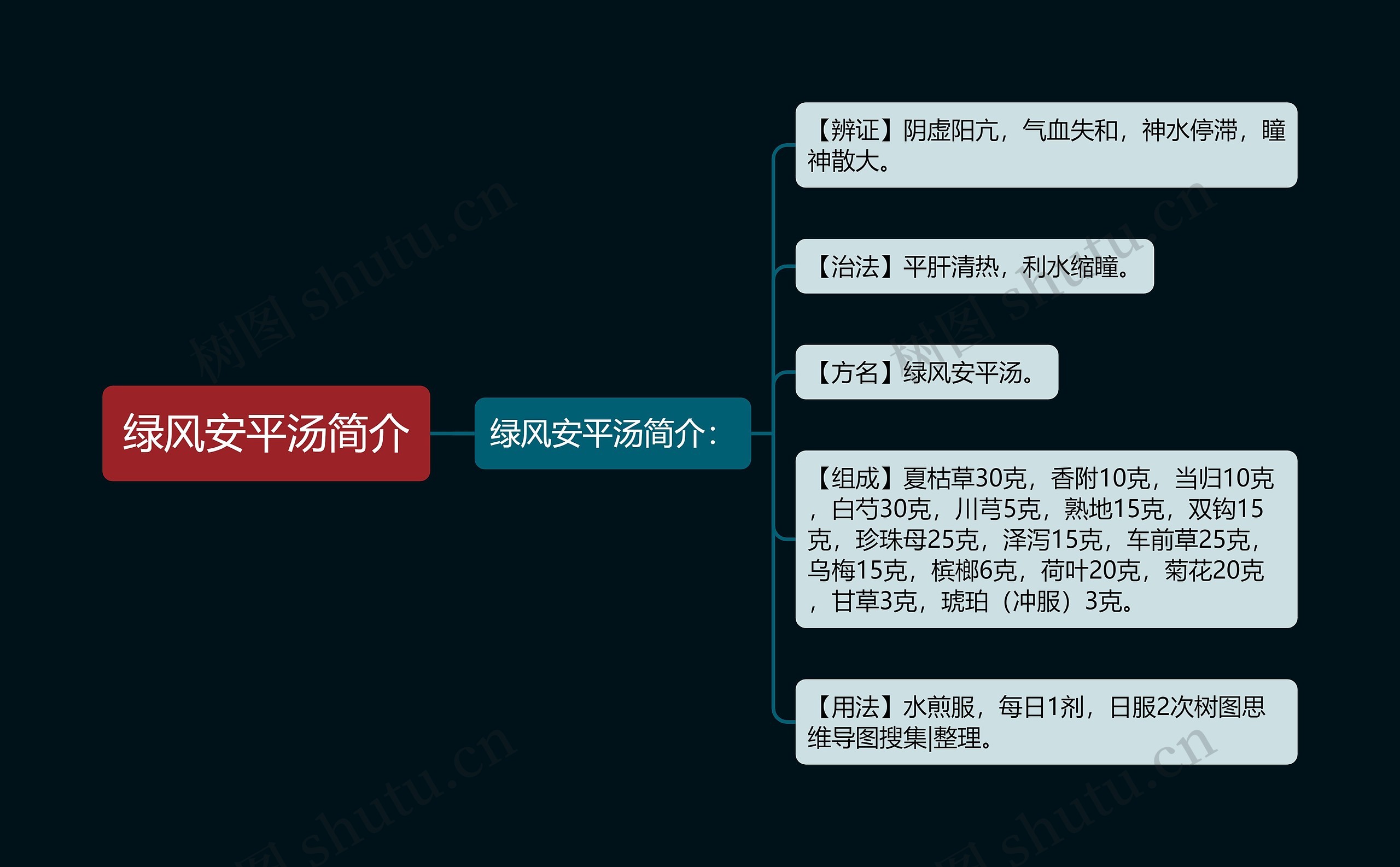树图思维导图提供《绿风安平汤简介》在线思维导图免费制作,点击“编辑”按钮,可对《绿风安平汤简介》进行在线思维导图编辑,本思维导图属于思维导图模板主题,文件编号是:619790265e05fac9eaeaab7df2b5ba85