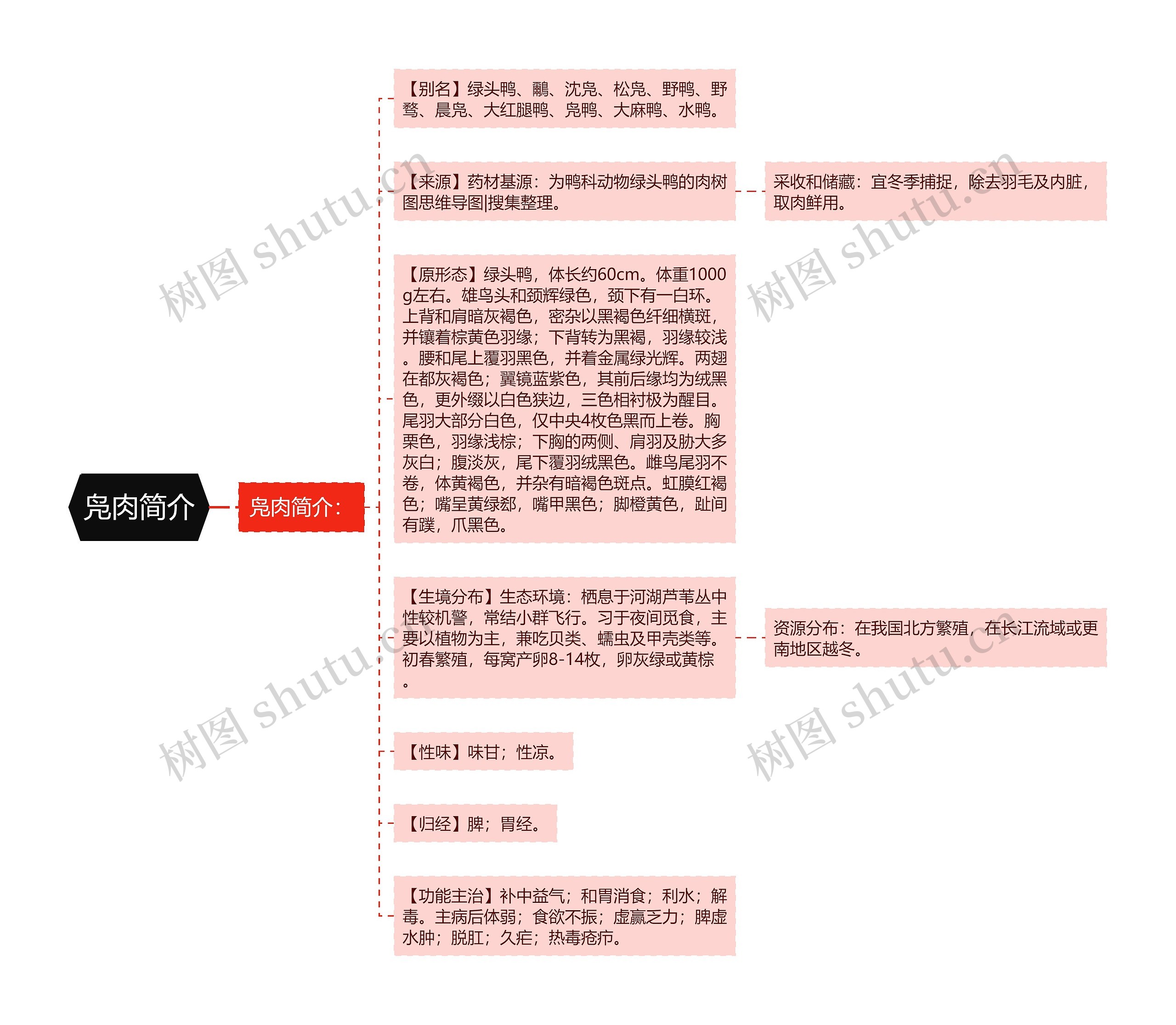 树图思维导图提供《凫肉简介》在线思维导图免费制作,点击“编辑”按钮,可对《凫肉简介》进行在线思维导图编辑,本思维导图属于思维导图模板主题,文件编号是:d5f0f030a83d4b5a2ba51ba573bef78d