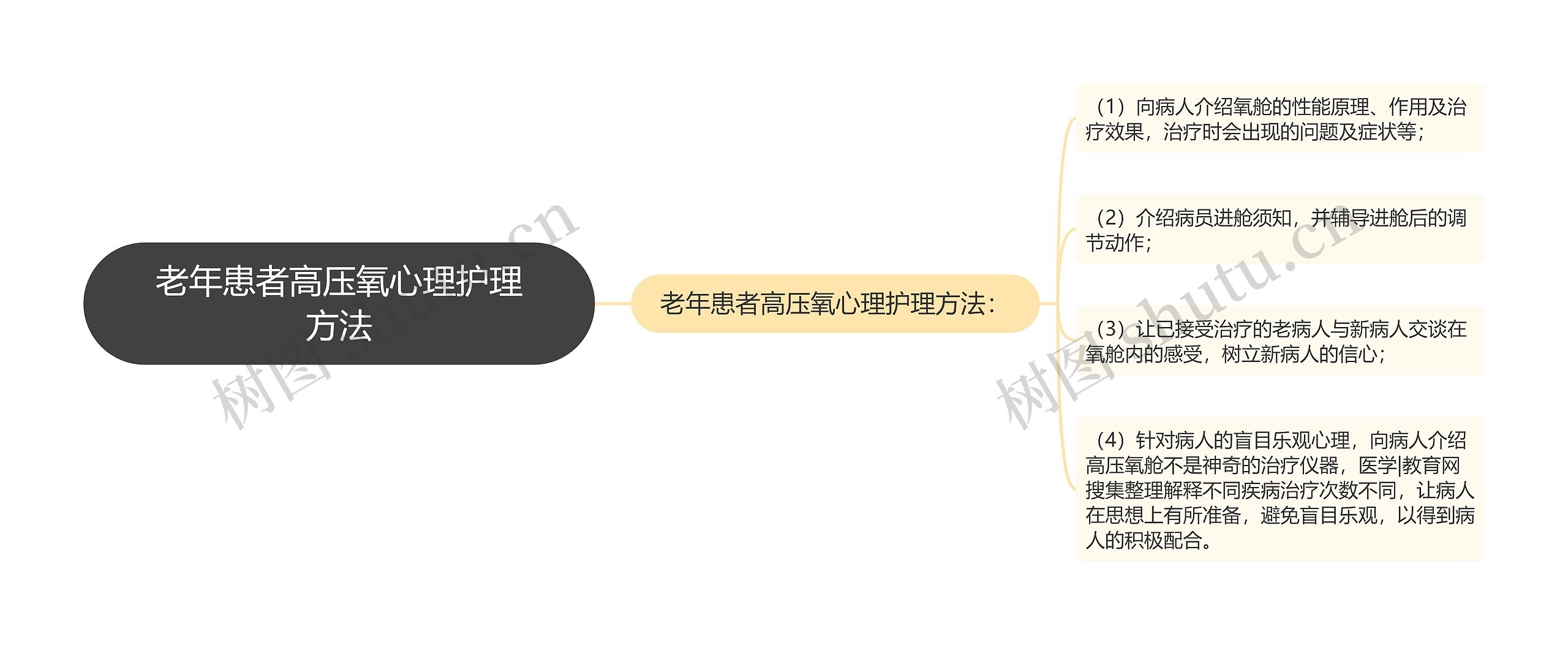 树图思维导图提供《老年患者高压氧心理护理方法》在线思维导图免费制作,点击“编辑”按钮,可对《老年患者高压氧心理护理方法》进行在线思维导图编辑,本思维导图属于思维导图模板主题,文件编号是:dc294c90b942fa05bba73bb5edba4dcf