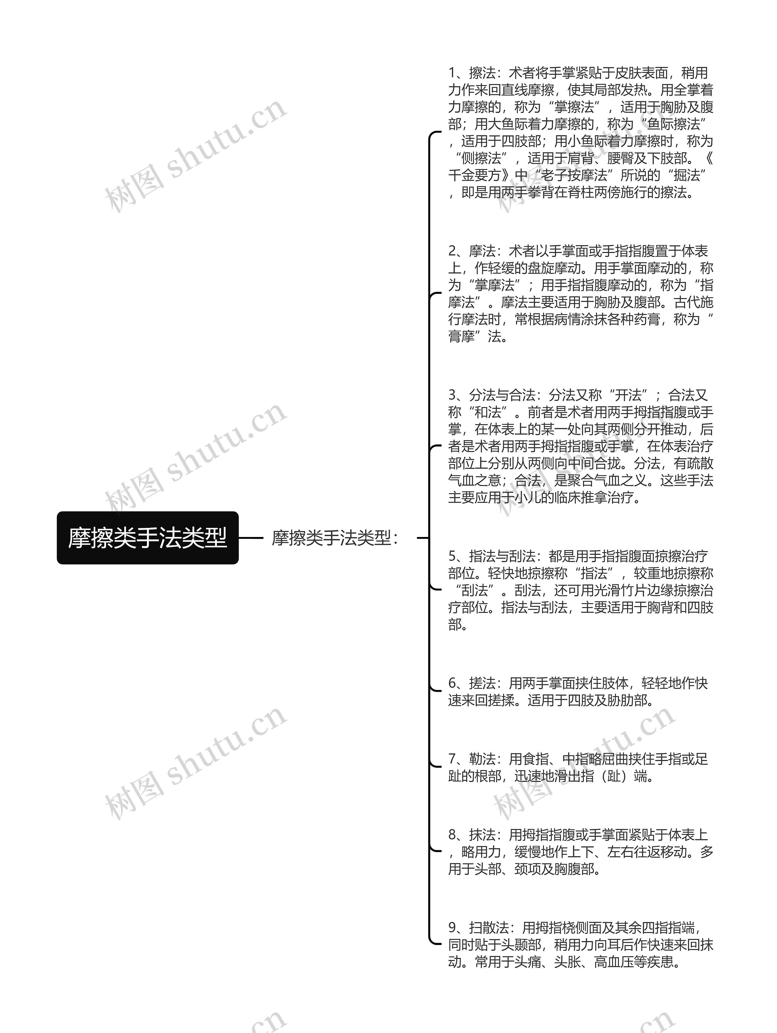 1、擦法:术者将手掌紧贴于皮肤表面,稍用力作来回直线摩擦,使其局部发热。用全掌着力摩擦的,称为“掌擦法”,适用于胸胁及腹部;用大鱼际着力摩擦的,称为“鱼际擦法”,适用于四肢部;用小鱼际着力摩擦时,称为“侧擦法”,适用于肩背、腰臀及下肢部。《千金要方》中“老子按摩法”所说的“掘法”,即是用两手拳背在脊柱两傍施行的擦法。