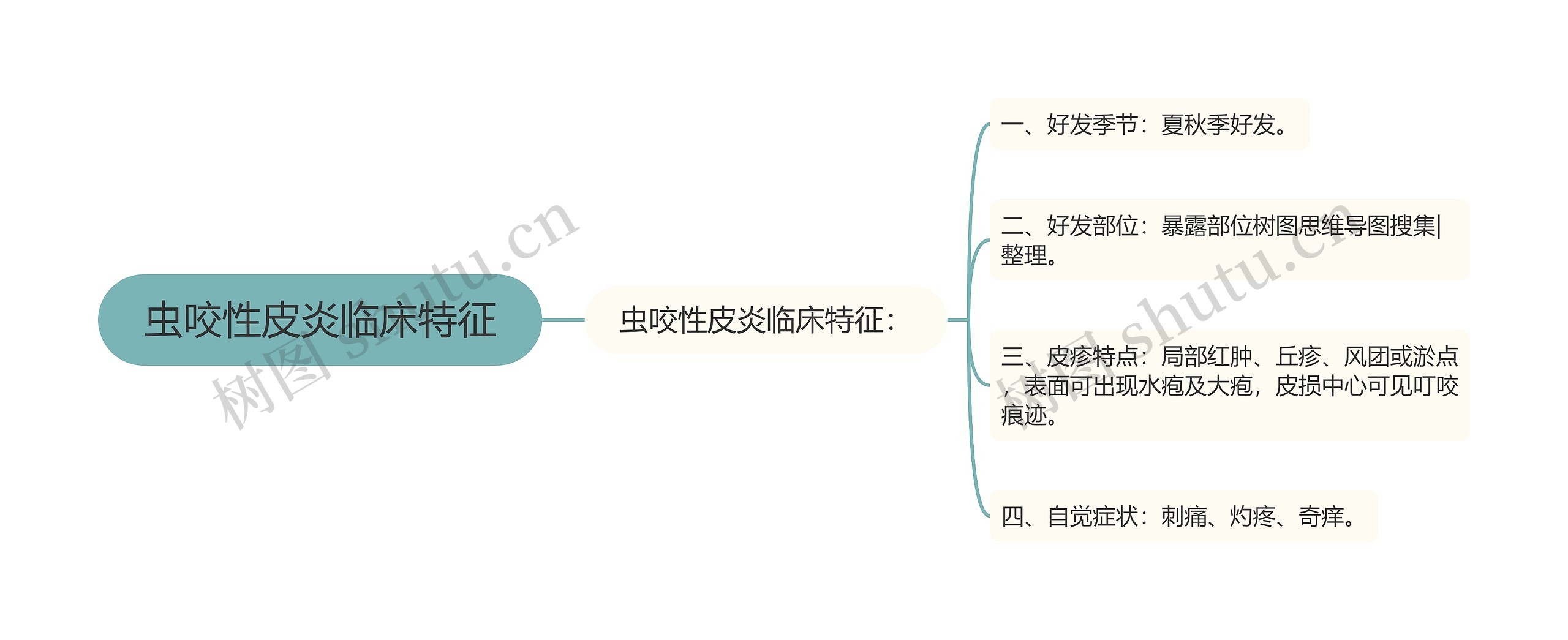 虫咬性皮炎临床特征: 一、好发季节:夏秋季好发。 二、好发部位:暴露部位树图思维导图搜集|整理。 三、皮疹特点:局部红肿、丘疹、风团或淤点,表面可出现水疱及大疱,皮损中心可见叮咬痕迹。 四、自觉症状:刺痛、灼疼、奇痒。