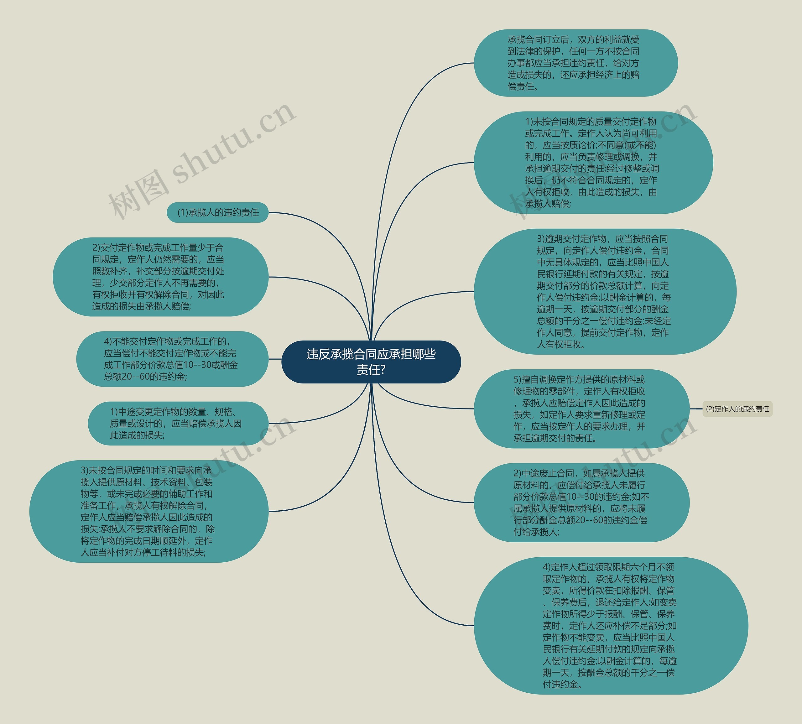 1)未按合同规定的质量交付定作物或完成工作。定作人认为尚可利用的,应当按质论价;不同意(或不能)利用的,应当负责修理或调换,并承担逾期交付的责任;经过修整或调换后,仍不符合合同规定的,定作人有权拒收,由此造成的损失,由承揽人赔偿;