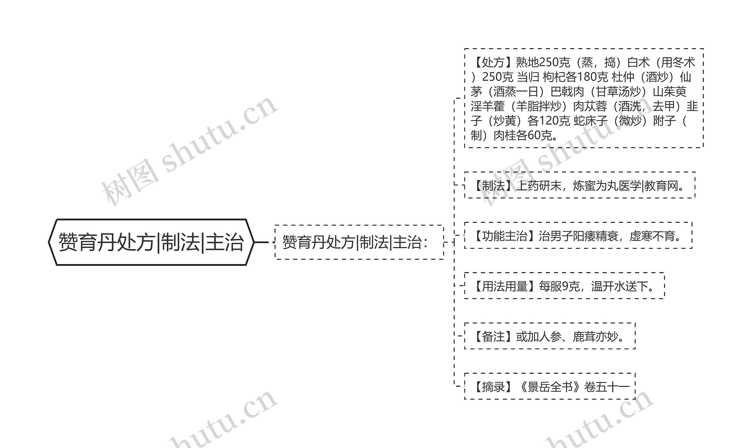 树图思维导图提供《赞育丹处方|制法|主治》在线思维导图免费制作,点击“编辑”按钮,可对《赞育丹处方|制法|主治》进行在线思维导图编辑,本思维导图属于思维导图模板主题,文件编号是:3fa56dd55c8dbf573a715aee691d2542