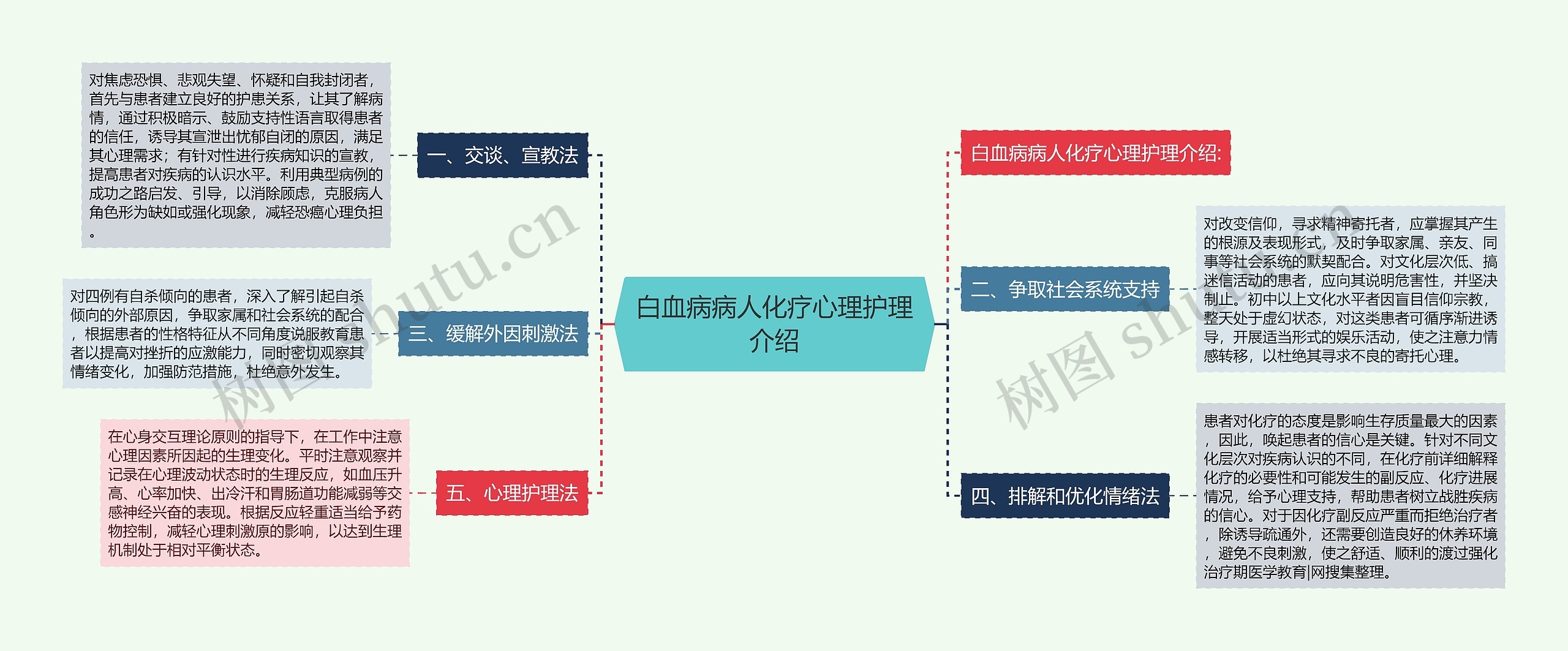 树图思维导图提供《白血病病人化疗心理护理介绍》在线思维导图免费制作,点击“编辑”按钮,可对《白血病病人化疗心理护理介绍》进行在线思维导图编辑,本思维导图属于思维导图模板主题,文件编号是:8d18d8b4a20f8b3e9a3a4178862397ec
