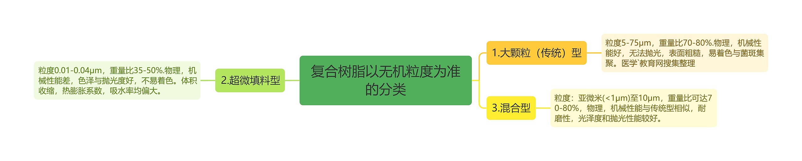 1.大颗粒(传统)型 粒度5-75μm,重量比70-80%.物理,机械性能好,无法抛光,表面粗糙,易着色与菌斑集聚。医学`教育网搜集整理 2.超微填料型 粒度0.01-0.04μm,重量比35-50%.物理,机械性能差,色泽与抛光度好,不易着色。体积收缩,热膨胀系数,吸水率均偏大。