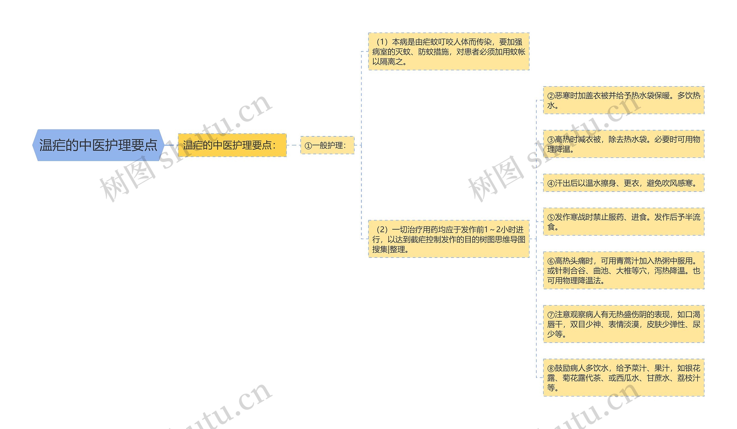 温疟的中医护理要点: ①一般护理: (1)本病是由疟蚊叮咬人体而传染,要加强病室的灭蚊、防蚊措施,对患者必须加用蚊帐以隔离之。 (2)一切治疗用药均应于发作前1~2小时进行,以达到截疟控制发作的目的树图思维导图搜集|整理。 ②恶寒时加盖衣被并给予热水袋保暖。多饮热水。 ③高热时减衣被,除去热水袋。