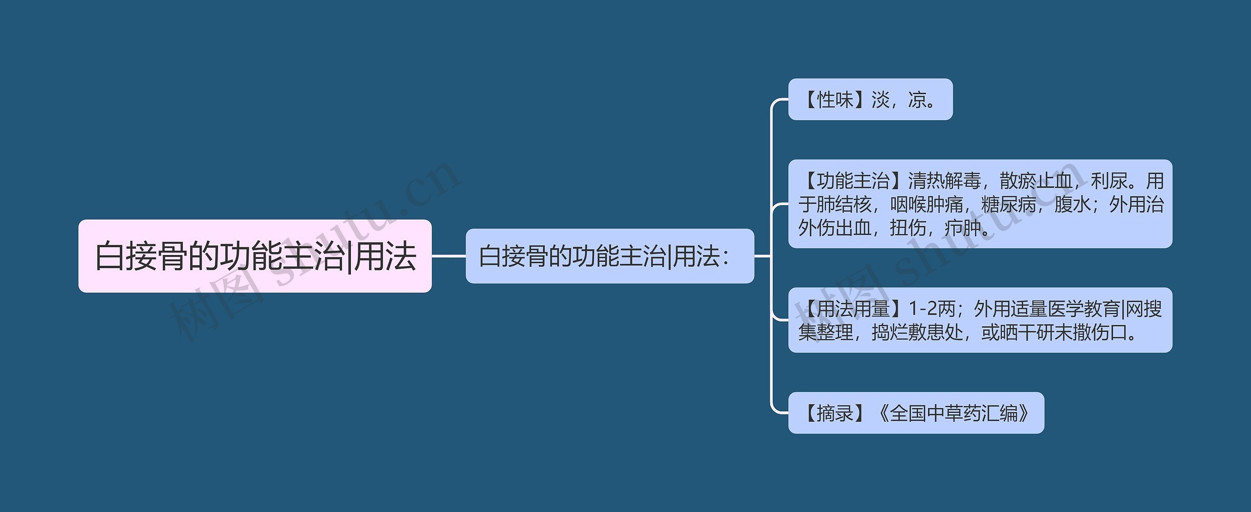 树图思维导图提供《白接骨的功能主治|用法》在线思维导图免费制作,点击“编辑”按钮,可对《白接骨的功能主治|用法》进行在线思维导图编辑,本思维导图属于思维导图模板主题,文件编号是:11158e43b76025839cc24c9c4ea1608a
