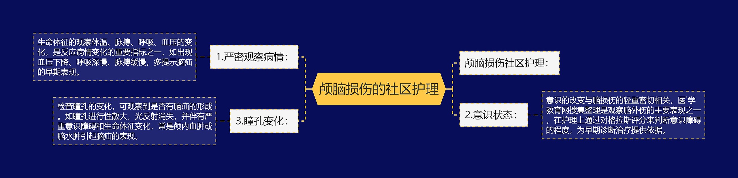 颅脑损伤社区护理: 1.严密观察病情: 生命体征的观察体温、脉搏、呼吸、血压的变化,是反应病情变化的重要指标之一,如出现血压下降、呼吸深慢、脉搏缓慢,多提示脑疝的早期表现。