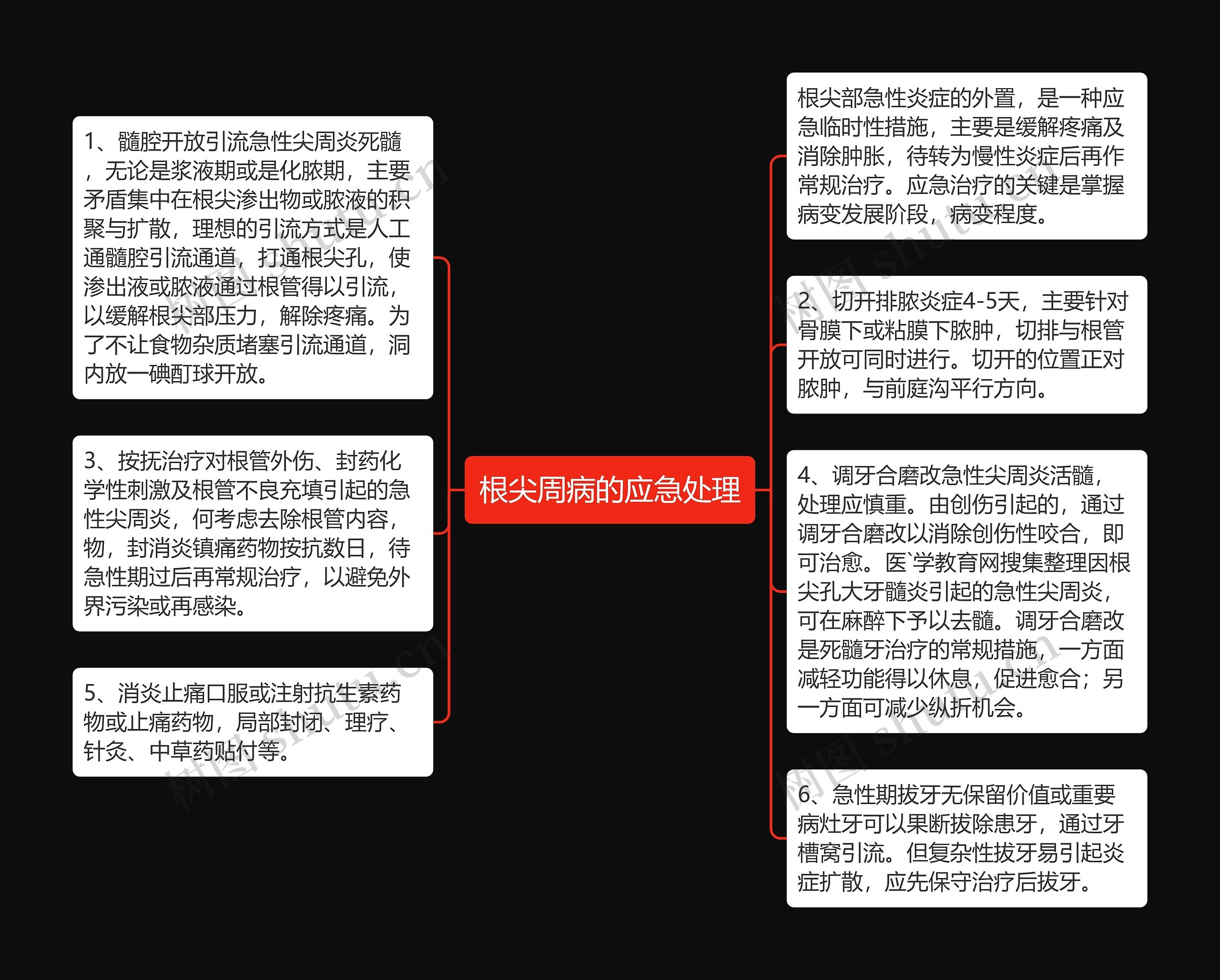 根尖部急性炎症的外置,是一种应急临时性措施,主要是缓解疼痛及消除肿胀,待转为慢性炎症后再作常规治疗。应急治疗的关键是掌握病变发展阶段,病变程度。