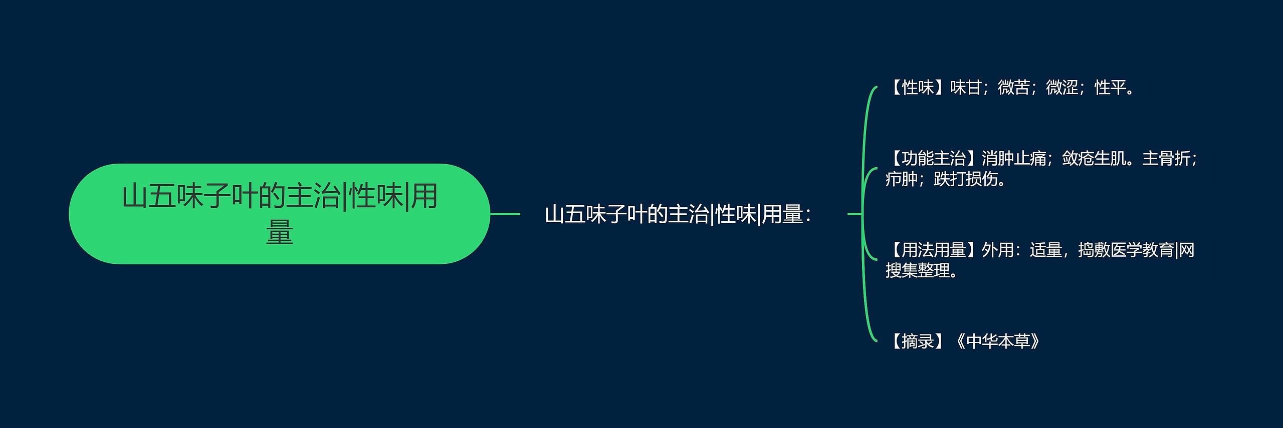 山五味子叶的主治|性味|用量: 【性味】味甘;微苦;微涩;性平。 【功能主治】消肿止痛;敛疮生肌。主骨折;疖肿;跌打损伤。 【用法用量】外用:适量,捣敷医学教育|网搜集整理。
