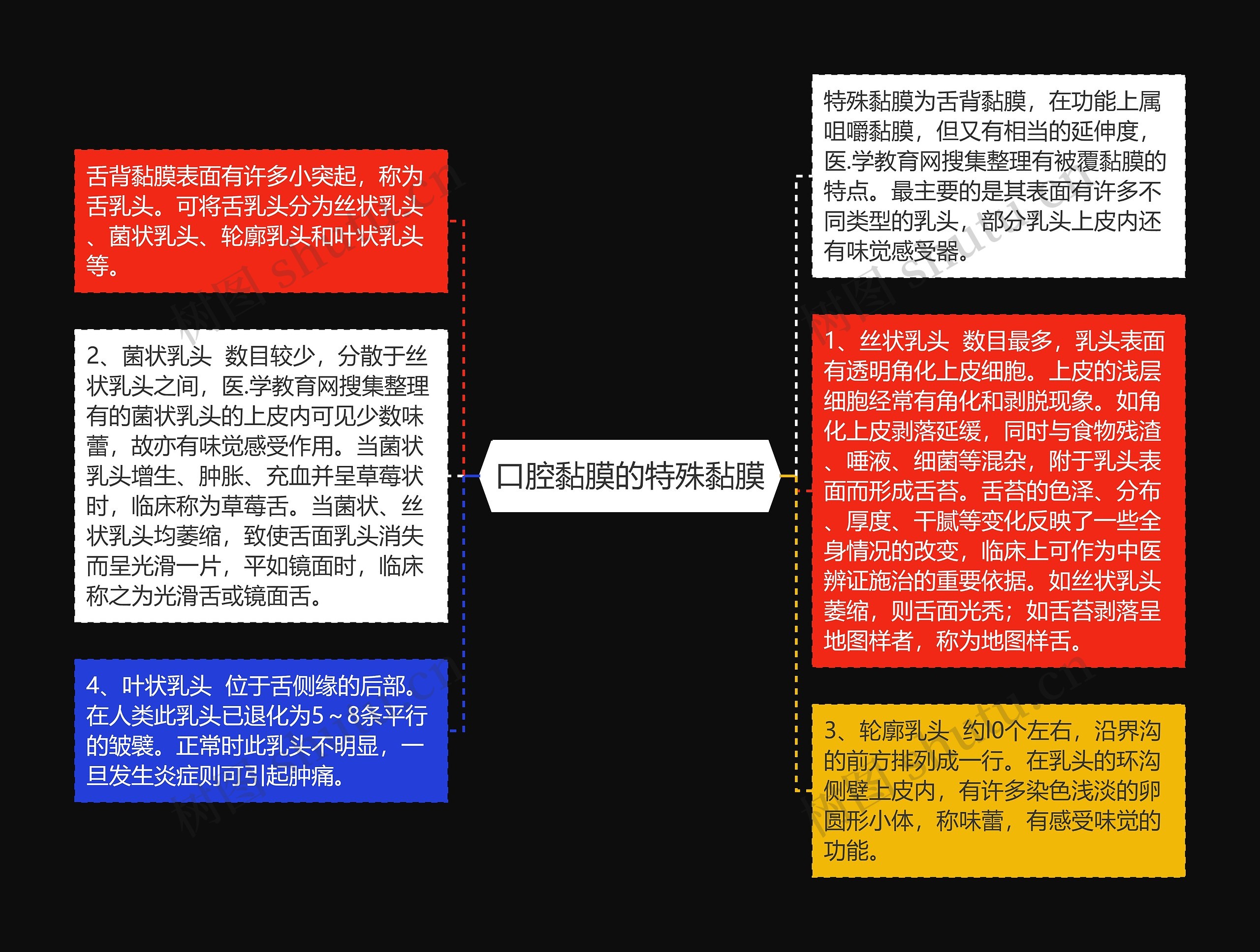 特殊黏膜为舌背黏膜,在功能上属咀嚼黏膜,但又有相当的延伸度,医.学教育网搜集整理有被覆黏膜的特点。最主要的是其表面有许多不同类型的乳头,部分乳头上皮内还有味觉感受器。