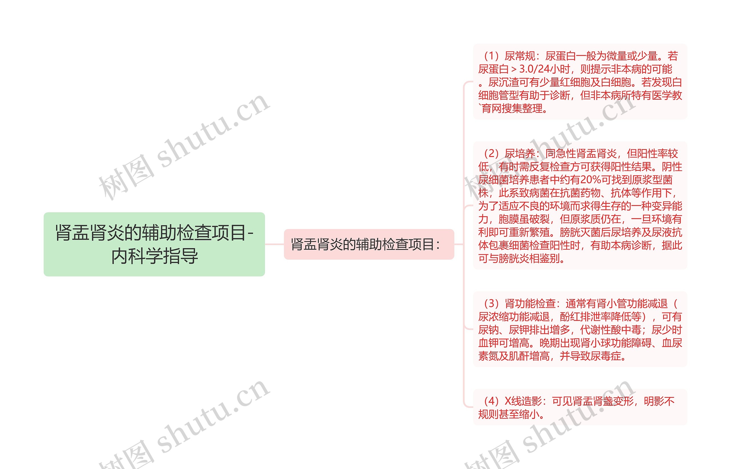 树图思维导图提供《肾盂肾炎的辅助检查项目-内科学指导》在线思维导图免费制作,点击“编辑”按钮,可对《肾盂肾炎的辅助检查项目-内科学指导》进行在线思维导图编辑,本思维导图属于思维导图模板主题,文件编号是:23688dcd86c45fd12acf89d89426acd2