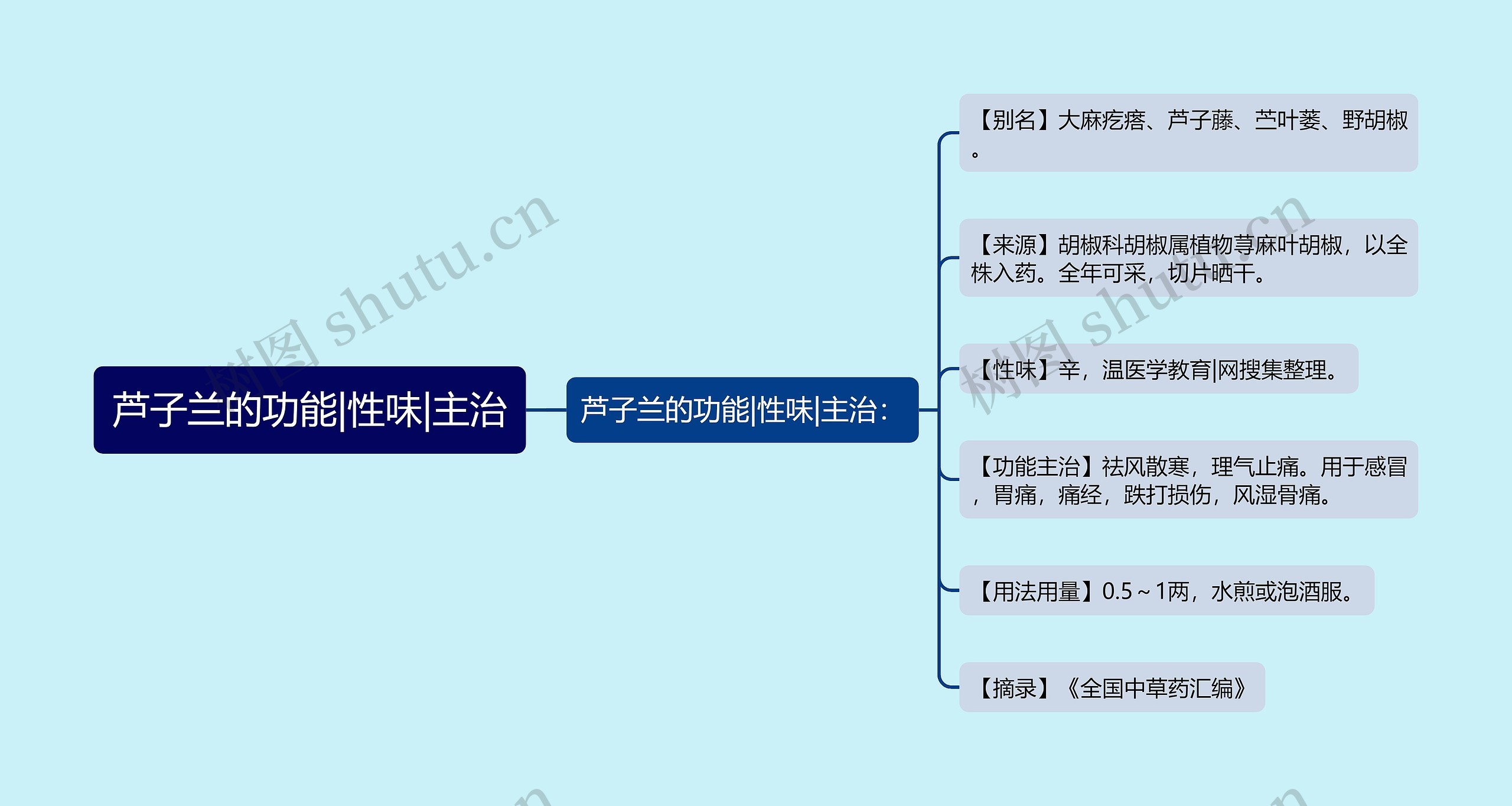 树图思维导图提供《芦子兰的功能|性味|主治》在线思维导图免费制作,点击“编辑”按钮,可对《芦子兰的功能|性味|主治》进行在线思维导图编辑,本思维导图属于思维导图模板主题,文件编号是:bac0dcc96c061949b145f5d17a429886
