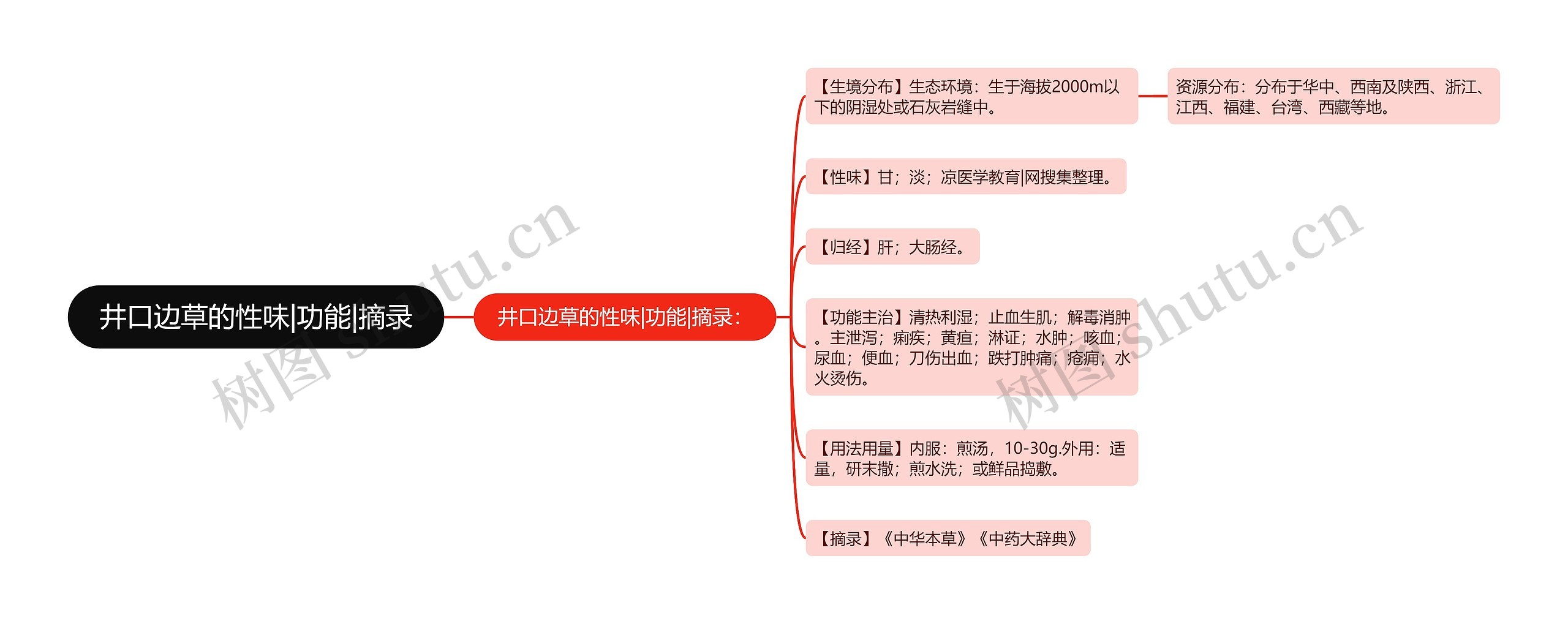 树图思维导图提供《井口边草的性味|功能|摘录》在线思维导图免费制作,点击“编辑”按钮,可对《井口边草的性味|功能|摘录》进行在线思维导图编辑,本思维导图属于思维导图模板主题,文件编号是:958ce0012ec0cc0c41d8f0602a320795