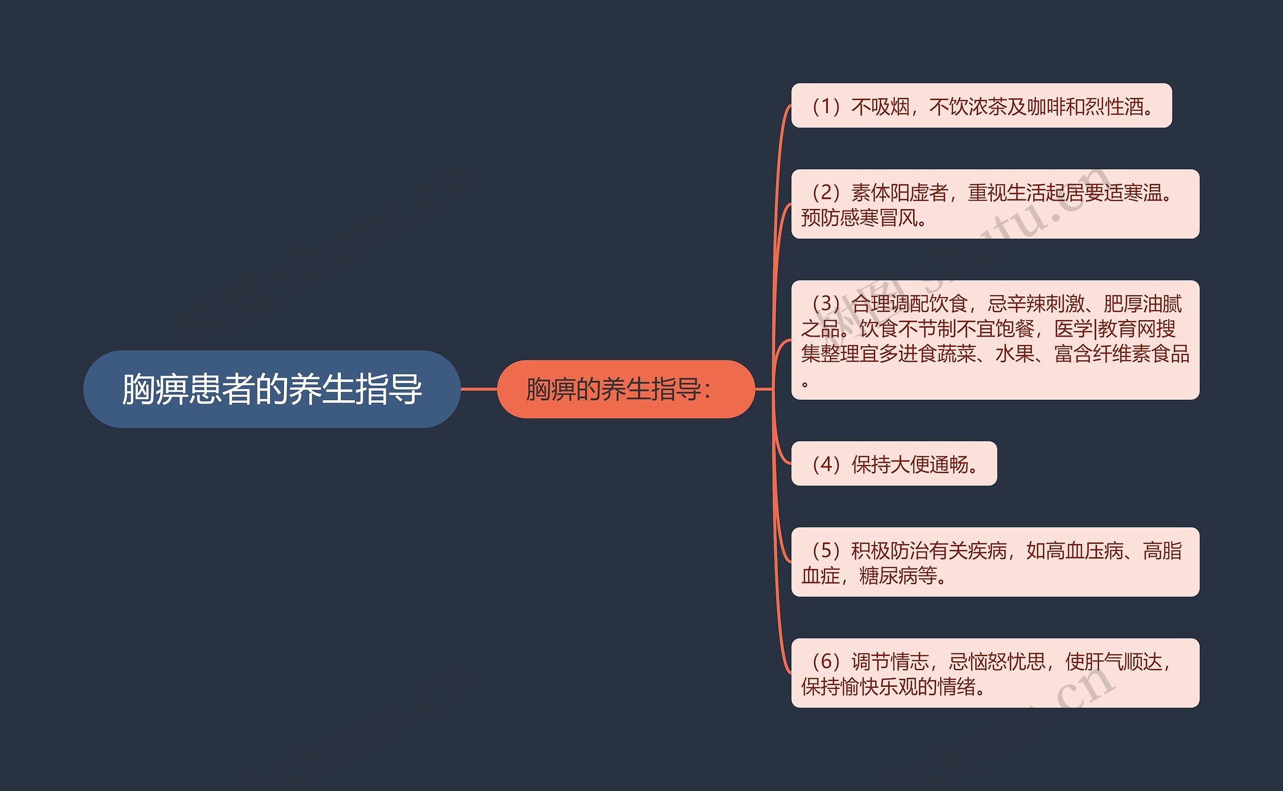 树图思维导图提供《胸痹患者的养生指导》在线思维导图免费制作,点击“编辑”按钮,可对《胸痹患者的养生指导》进行在线思维导图编辑,本思维导图属于思维导图模板主题,文件编号是:cbbd4fac2b3e9e11468f8934d906735e