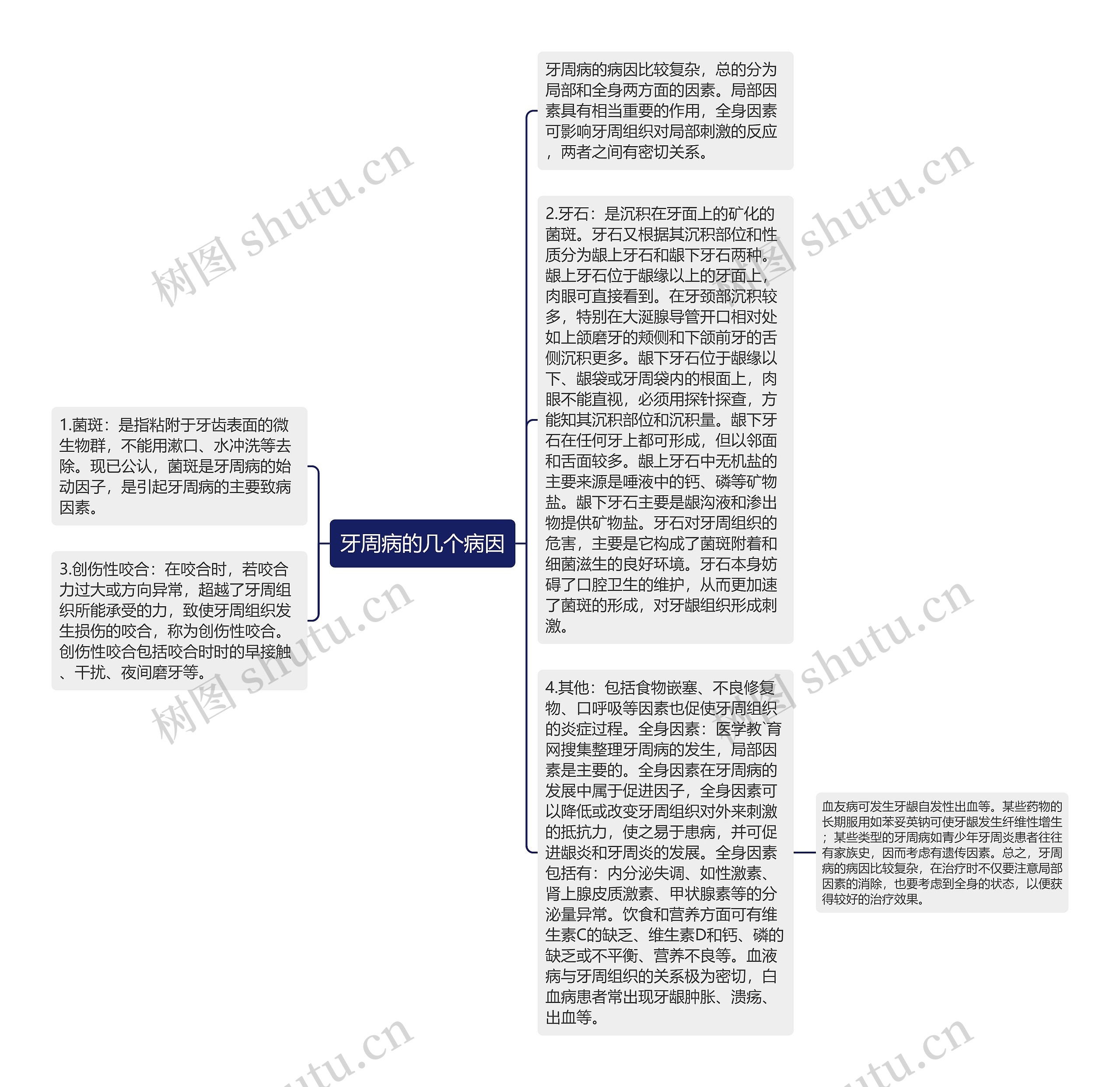 牙周病的病因比较复杂,总的分为局部和全身两方面的因素。局部因素具有相当重要的作用,全身因素可影响牙周组织对局部刺激的反应,两者之间有密切关系。