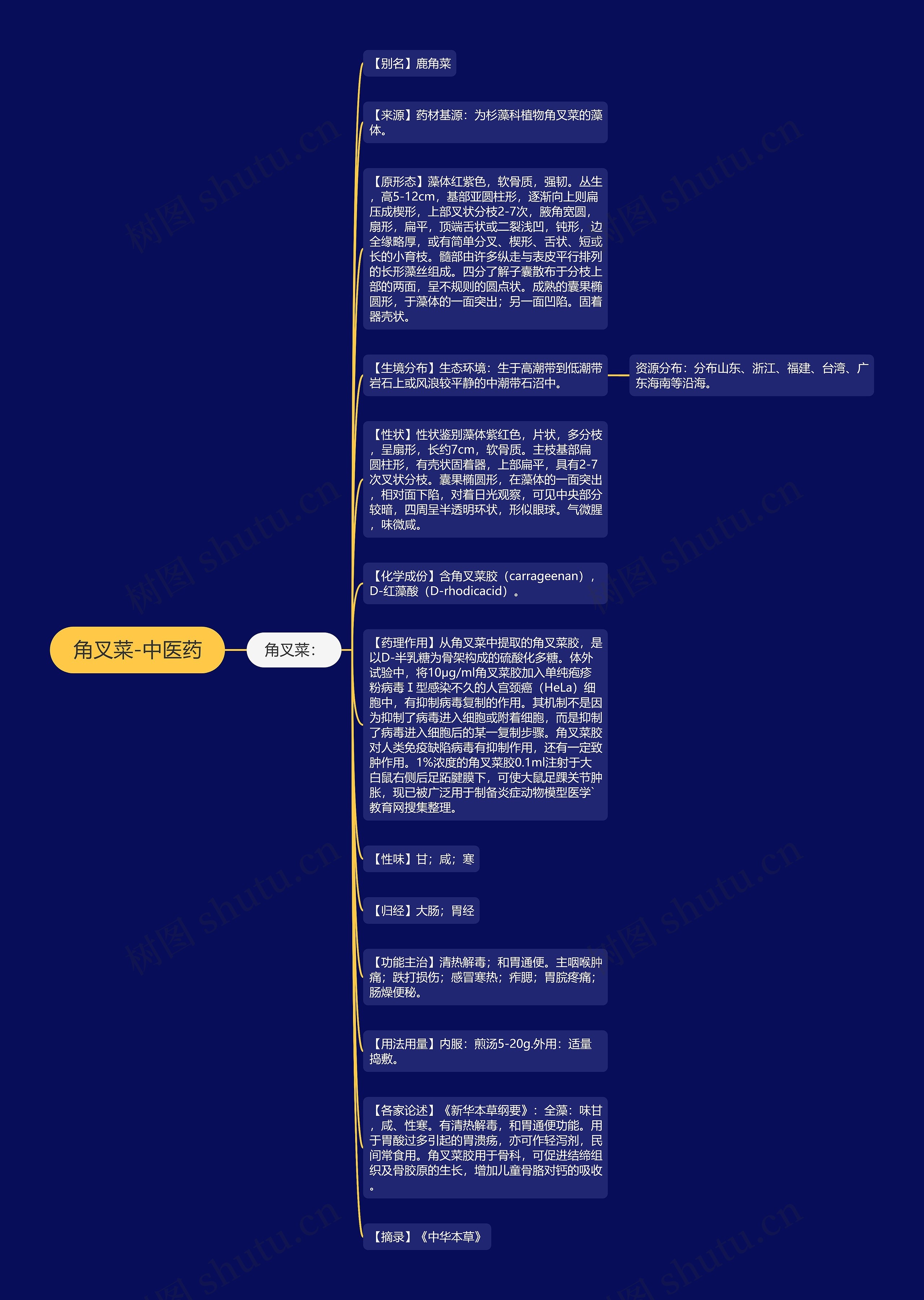 【各家论述】《新华本草纲要》:全藻:味甘,咸、性寒。有清热解毒,和胃通便功能。用于胃酸过多引起的胃溃疡,亦可作轻泻剂,民间常食用。角叉菜胶用于骨科,可促进结缔组织及骨胶原的生长,增加儿童骨胳对钙的吸收。