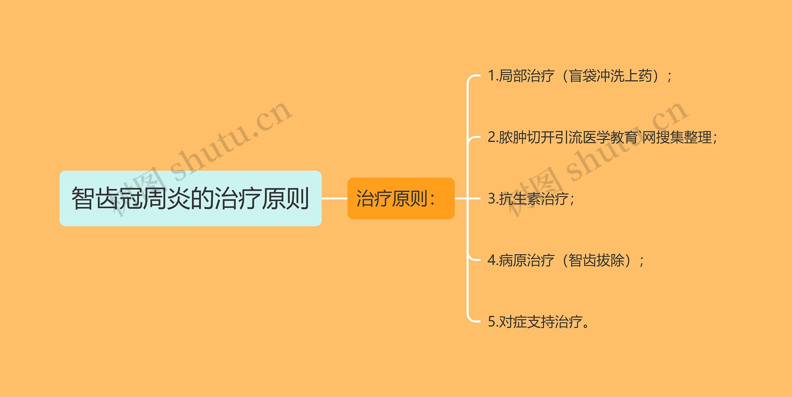 治疗原则: 1.局部治疗(盲袋冲洗上药); 2.脓肿切开引流医学教育`网搜集整理; 3.抗生素治疗; 4.病原治疗(智齿拔除); 5.对症支持治疗。