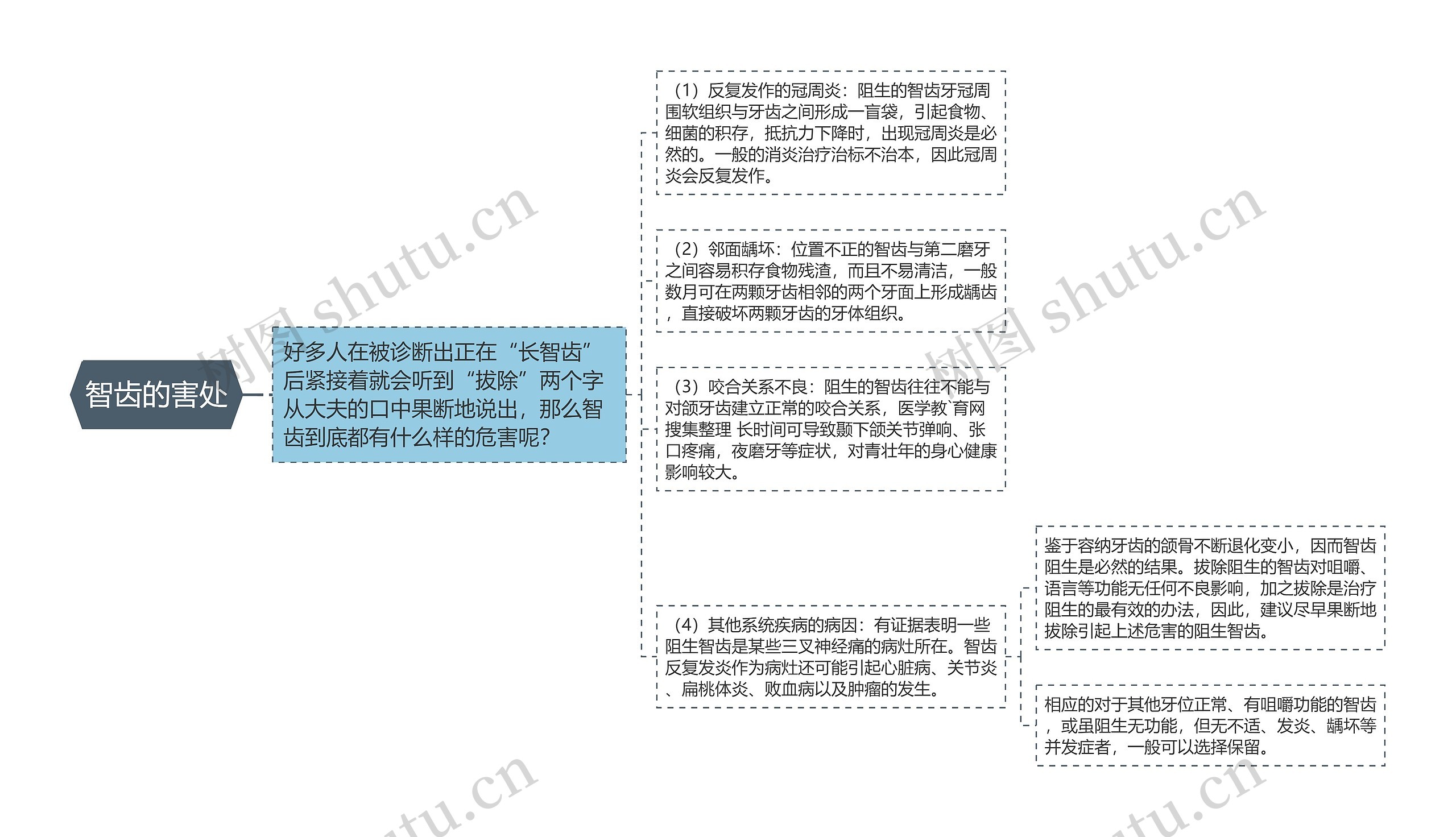 树图思维导图提供《智齿的害处》在线思维导图免费制作,点击“编辑”按钮,可对《智齿的害处》进行在线思维导图编辑,本思维导图属于思维导图模板主题,文件编号是:e7a401f5a649ad3d5d92820b33415aa9