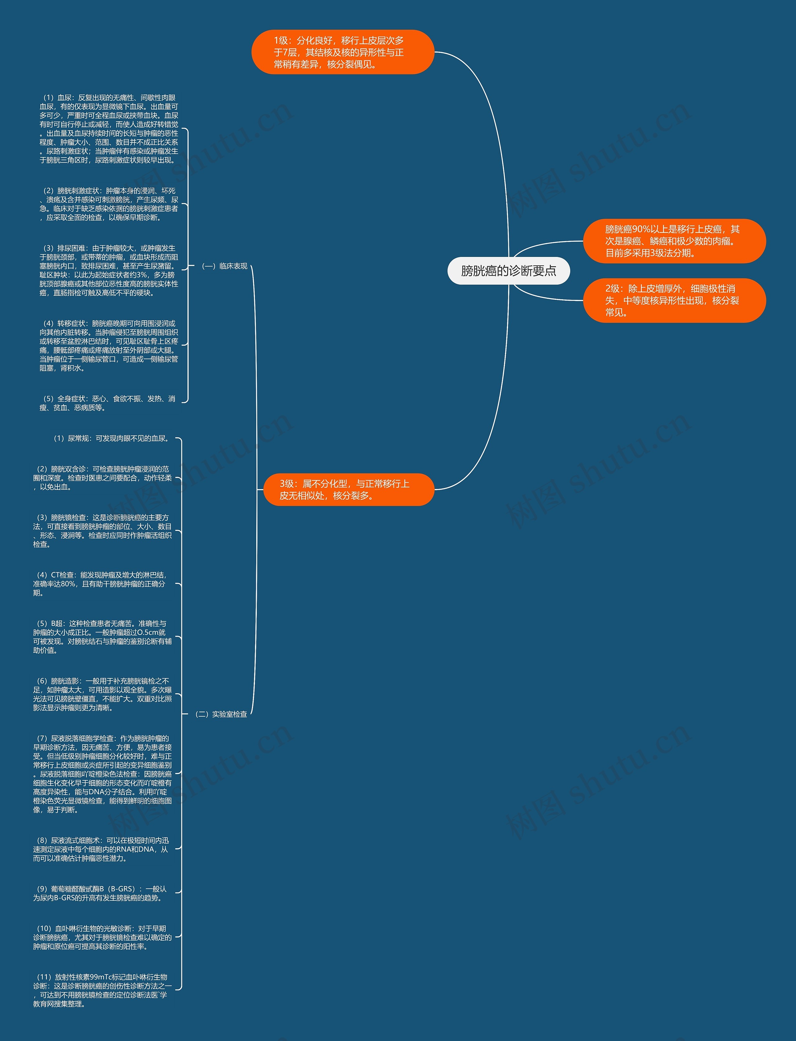 (7)尿液脱落细胞学检查:作为膀胱肿瘤的早期诊断方法,因无痛苦、方便,易为患者接受。但当低级别肿瘤细胞分化较好时,难与正常移行上皮细胞或炎症所引起的变异细胞鉴别。尿液脱落细胞吖啶橙染色法检查:因膀胱癌细胞生化变化早于细胞的形态变化而吖啶橙有高度异染性,能与DNA分子结合。利用吖啶橙染色荧光显微镜检查,能得到鲜明的细胞图像,易于判断。