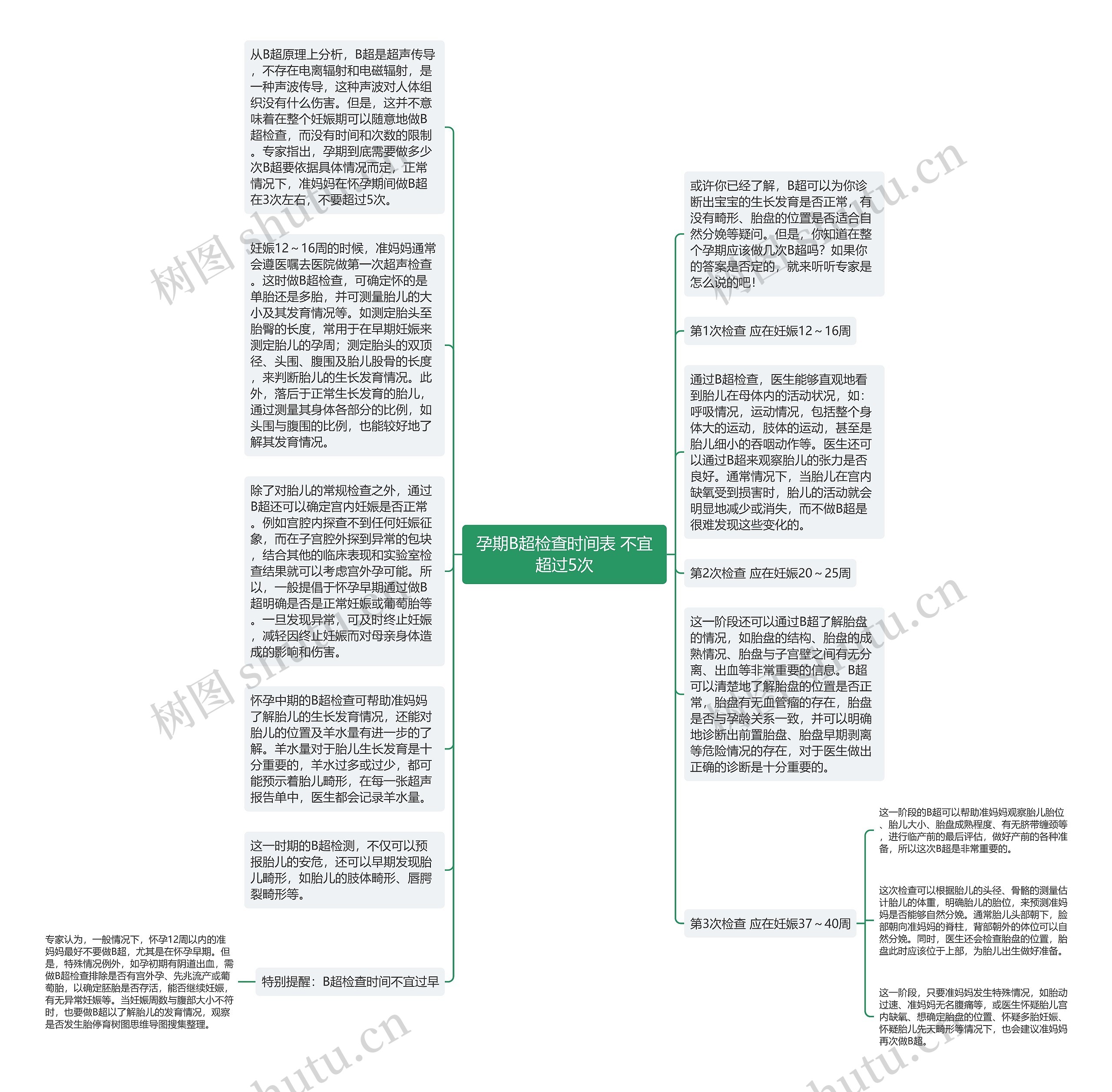 专家认为,一般情况下,怀孕12周以内的准妈妈最好不要做B超,尤其是在怀孕早期。但是,特殊情况例外,如孕初期有阴道出血,需做B超检查排除是否有宫外孕、先兆流产或葡萄胎,以确定胚胎是否存活,能否继续妊娠,有无异常妊娠等。当妊娠周数与腹部大小不符时,也要做B超以了解胎儿的发育情况,观察是否发生胎停育树图思维导图搜集整理。