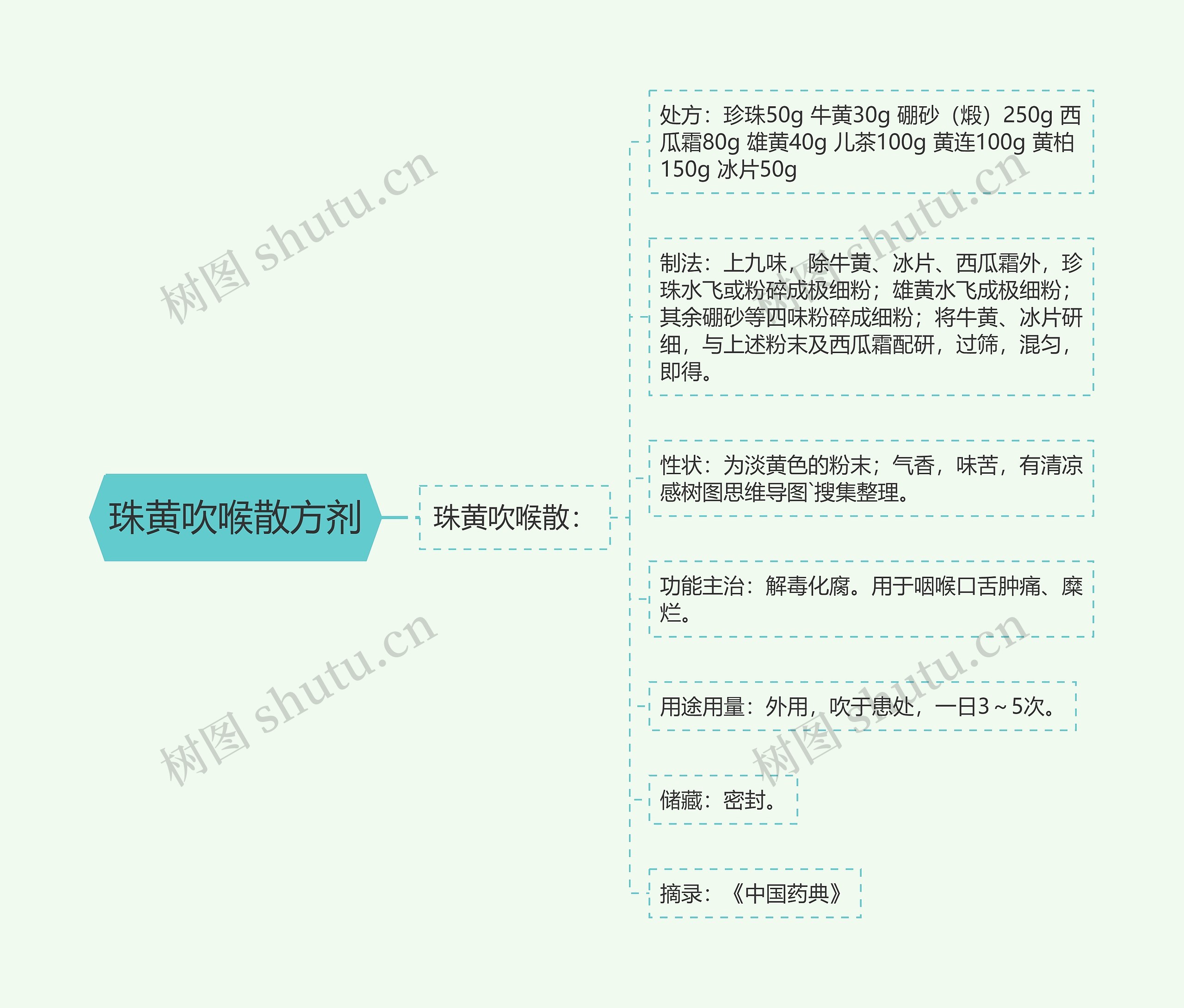 树图思维导图提供《珠黄吹喉散方剂》在线思维导图免费制作,点击“编辑”按钮,可对《珠黄吹喉散方剂》进行在线思维导图编辑,本思维导图属于思维导图模板主题,文件编号是:ebe8dc0f2d582cdb3aa3c911d8779247