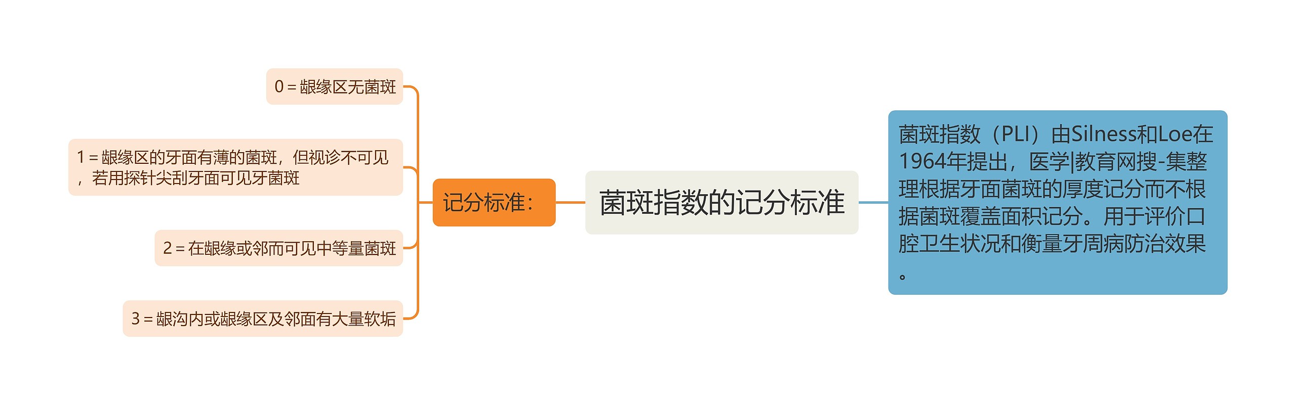 菌斑指数(PLI)由Silness和Loe在1964年提出,医学|教育网搜-集整理根据牙面菌斑的厚度记分而不根据菌斑覆盖面积记分。用于评价口腔卫生状况和衡量牙周病防治效果。
