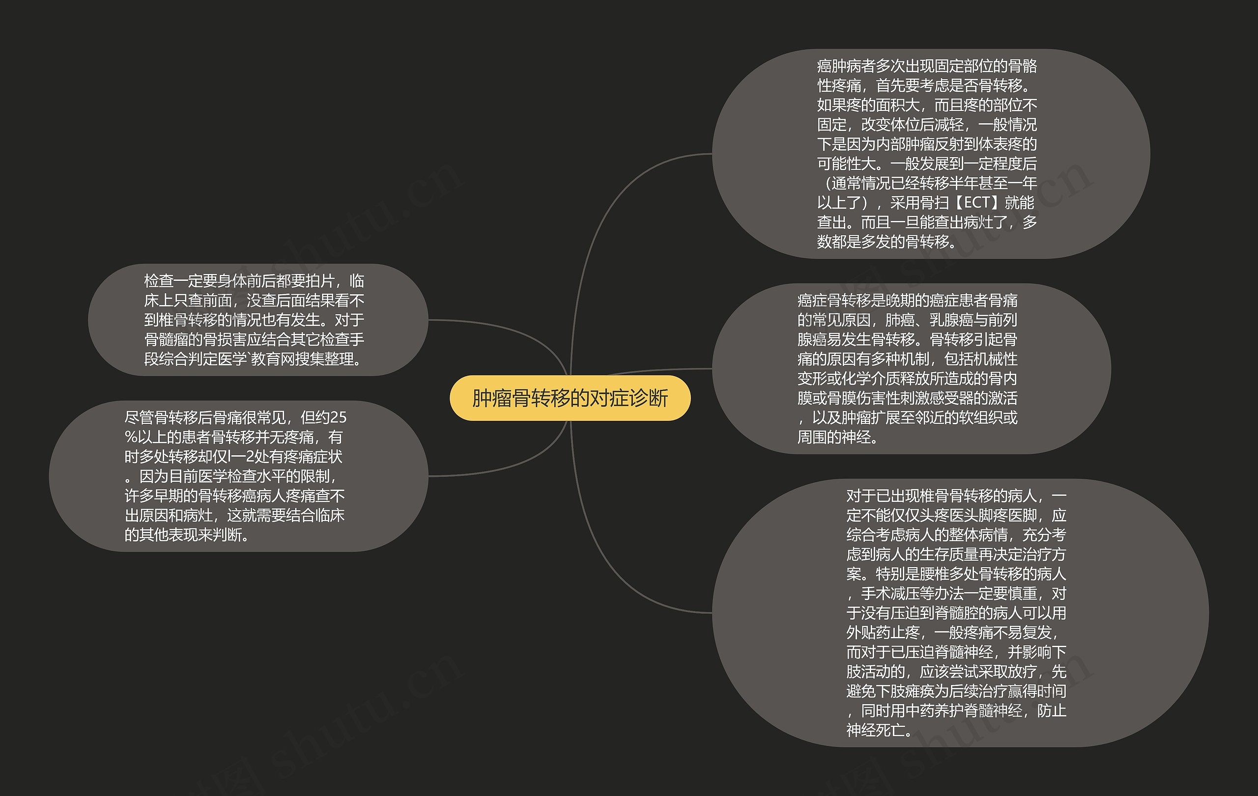 癌肿病者多次出现固定部位的骨骼性疼痛,首先要考虑是否骨转移。如果疼的面积大,而且疼的部位不固定,改变体位后减轻,一般情况下是因为内部肿瘤反射到体表疼的可能性大。一般发展到一定程度后(通常情况已经转移半年甚至一年以上了),采用骨扫【ECT】就能查出。而且一旦能查出病灶了,多数都是多发的骨转移。