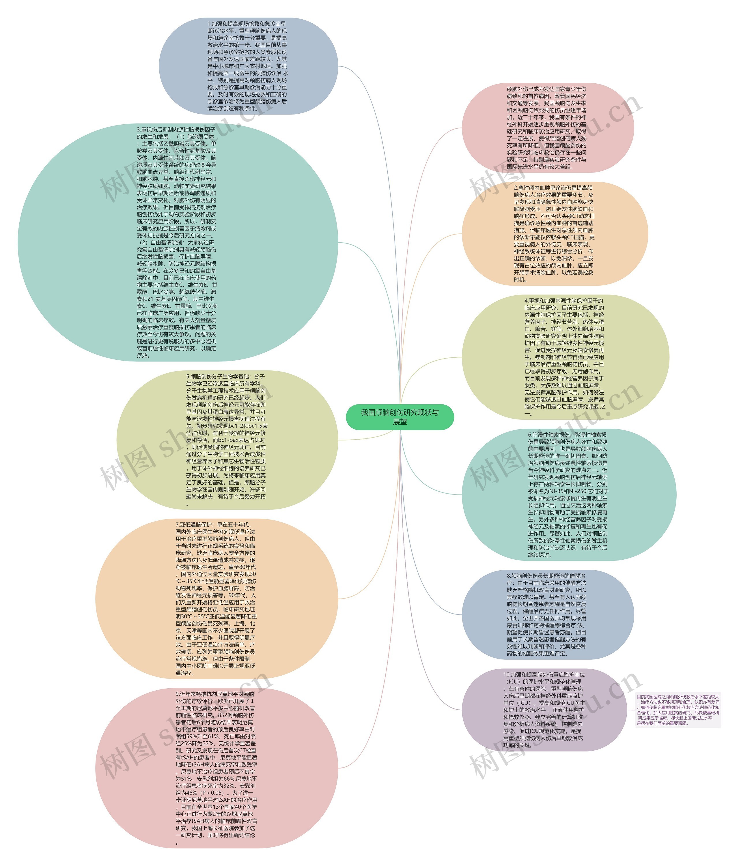 7.亚低温脑保护:早在五十年代,国内外临床医生曾将冬眠低温疗法用于治疗重型颅脑创伤病人,但由于当时未进行正规系统的实验和临床研究,缺乏临床病人安全方便的降温方法以及低温造成并发症,逐渐被临床医生所遗忘。直至80年代,国内外通过大量实验研究发现30℃~35℃亚低温能显著降低颅脑伤动物死残率、保护血脑屏障、防治继发性神经元损害等。90年代,人们又重新开始将亚低温应用于救治重型颅脑创伤伤员,临床研究也证明30℃~35℃亚低温能显著降低重型颅脑创伤伤员死残率。上海、北京、天津等国内不少医院都开展了这方面临床工作,并且取得明显疗效。由于亚低温治疗方法简单、疗效确切,应列为重型颅脑创伤伤员治疗常规措施。但由于条件限制,国内中小医院尚难以开展正规亚低温治疗。