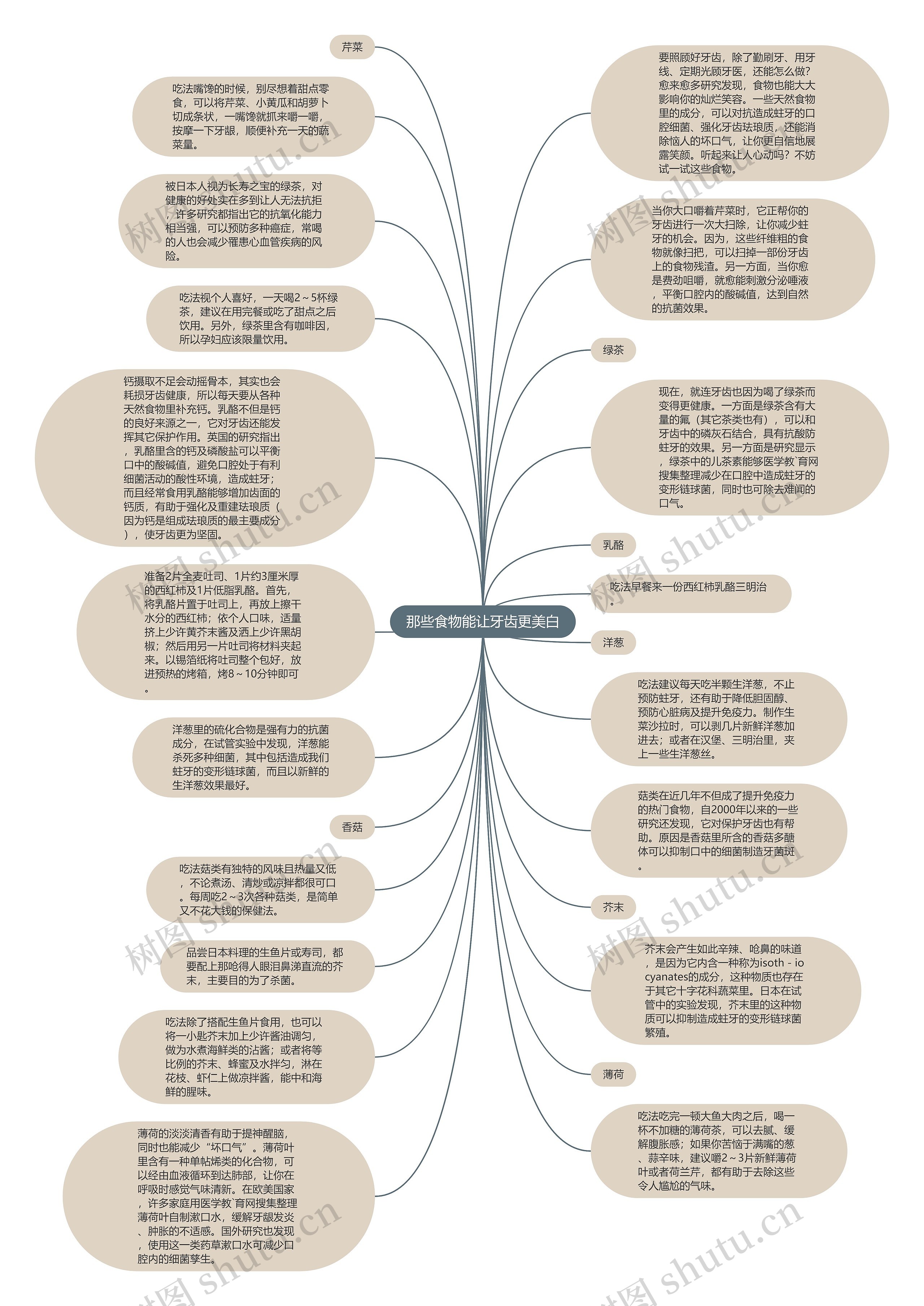 当你大口嚼着芹菜时,它正帮你的牙齿进行一次大扫除,让你减少蛀牙的机会。因为,这些纤维粗的食物就像扫把,可以扫掉一部份牙齿上的食物残渣。另一方面,当你愈是费劲咀嚼,就愈能刺激分泌唾液,平衡口腔内的酸碱值,达到自然的抗菌效果。