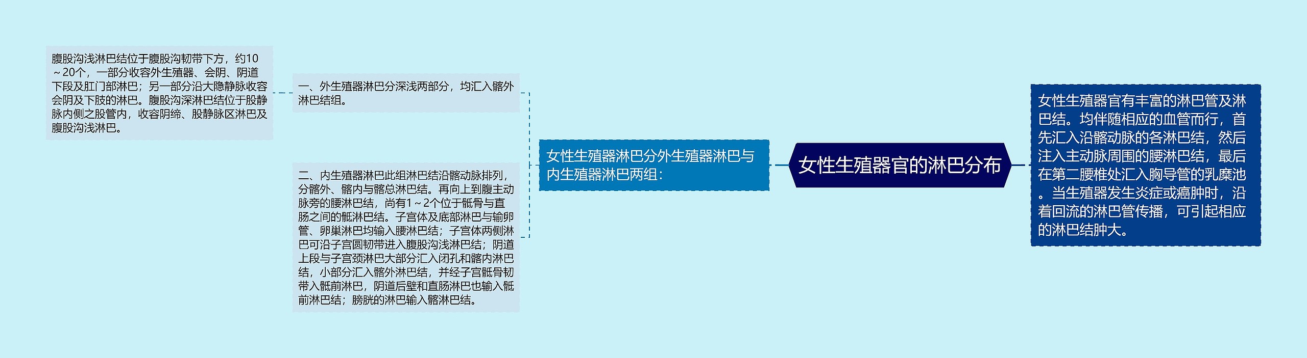 女性生殖器官有丰富的淋巴管及淋巴结。均伴随相应的血管而行,首先汇入沿髂动脉的各淋巴结,然后注入主动脉周围的腰淋巴结,最后在第二腰椎处汇入胸导管的乳糜池。当生殖器发生炎症或癌肿时,沿着回流的淋巴管传播,可引起相应的淋巴结肿大。