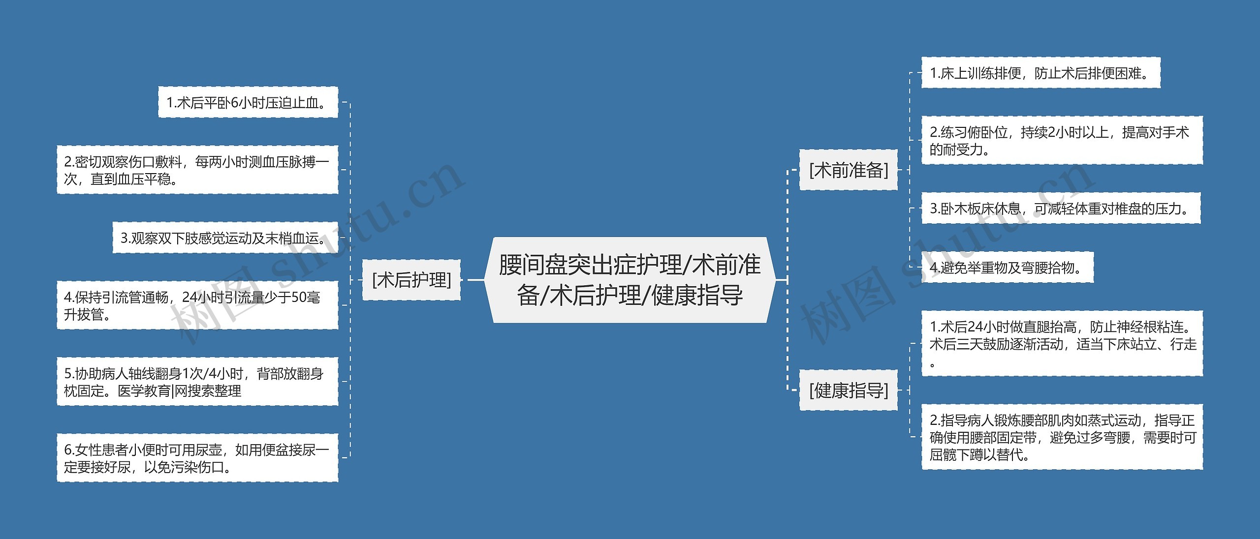 [术前准备] 1.床上训练排便,防止术后排便困难。 2.练习俯卧位,持续2小时以上,提高对手术的耐受力。 3.卧木板床休息,可减轻体重对椎盘的压力。 4.避免举重物及弯腰拾物。 [术后护理] 1.术后平卧6小时压迫止血。 2.密切观察伤口敷料,每两小时测血压脉搏一次,直到血压平稳。 3.观察双下肢感觉运动及末梢血运。