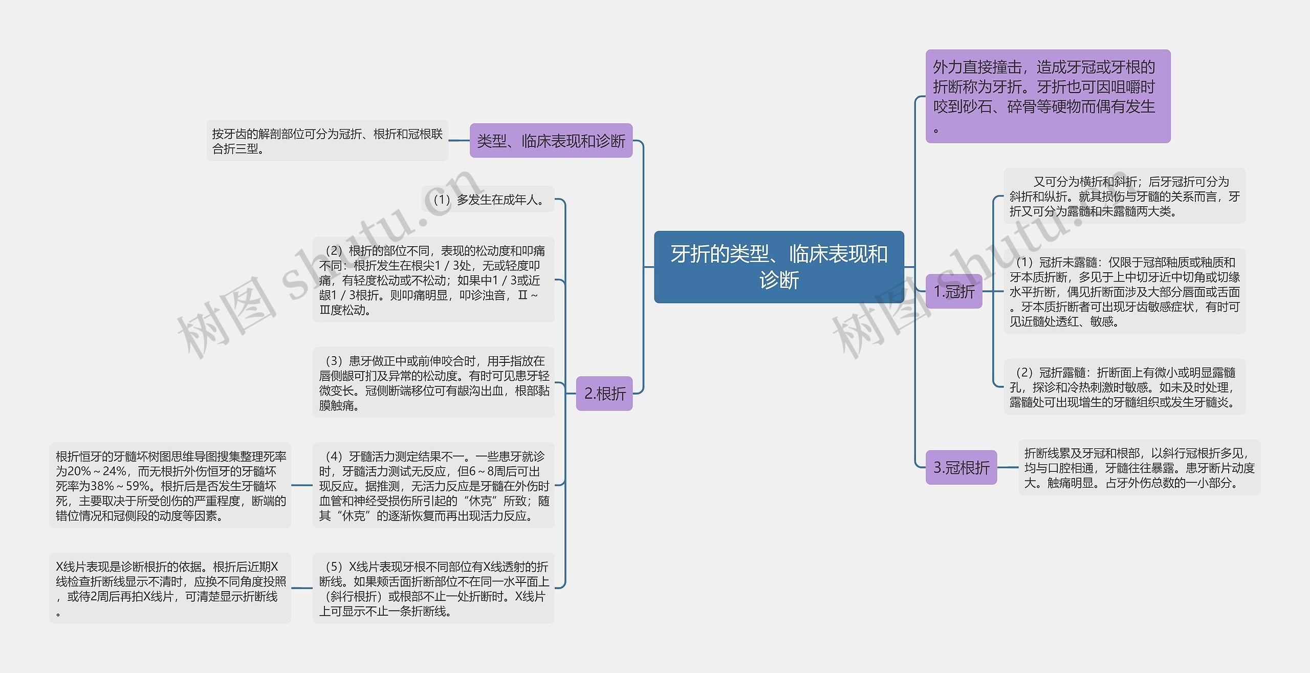 树图思维导图提供《牙折的类型、临床表现和诊断》在线思维导图免费制作,点击“编辑”按钮,可对《牙折的类型、临床表现和诊断》进行在线思维导图编辑,本思维导图属于思维导图模板主题,文件编号是:2667afaa4dd3650350e8162ab4643c24