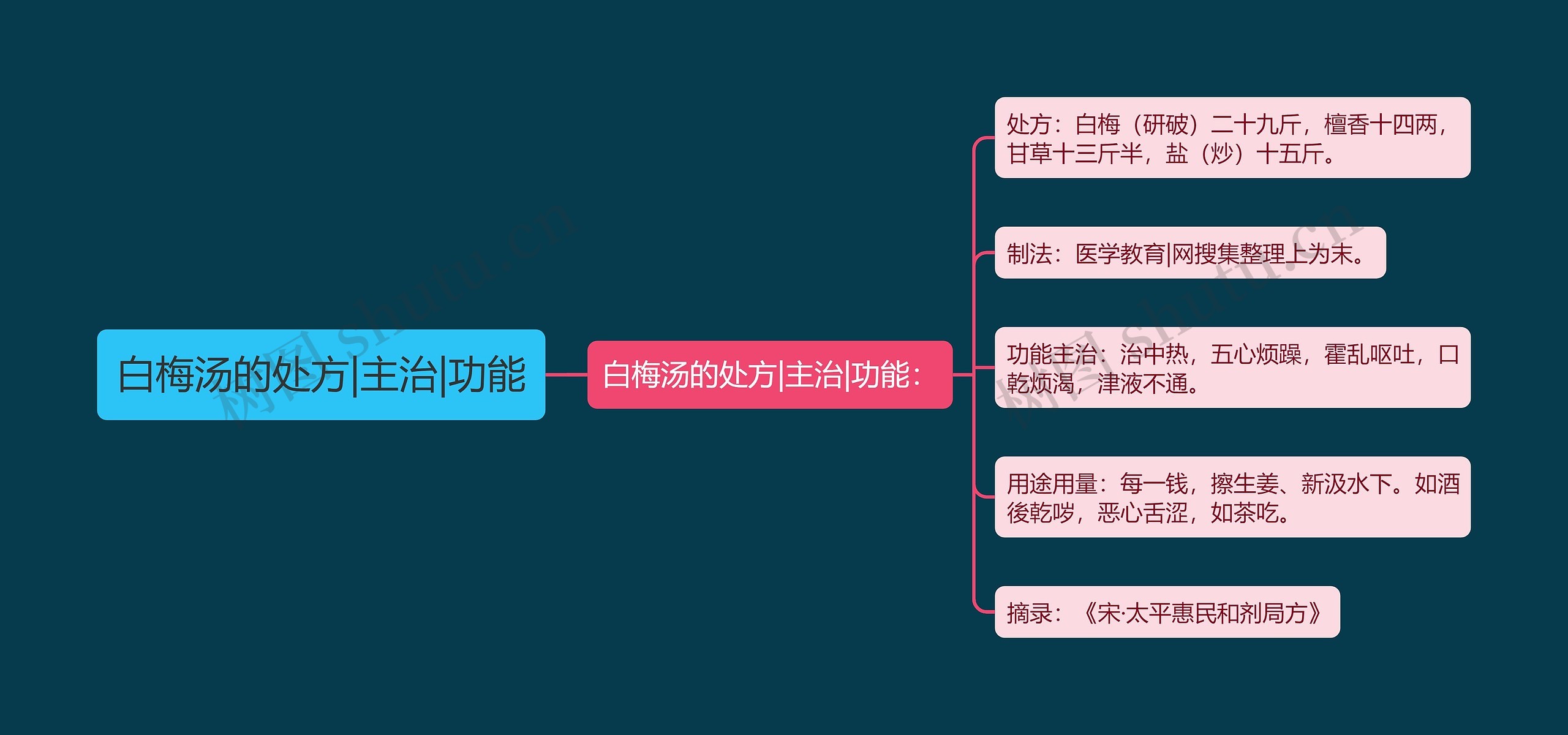 树图思维导图提供《白梅汤的处方|主治|功能》在线思维导图免费制作,点击“编辑”按钮,可对《白梅汤的处方|主治|功能》进行在线思维导图编辑,本思维导图属于思维导图模板主题,文件编号是:6c41db83964607b7775cd1e8e39d0c08