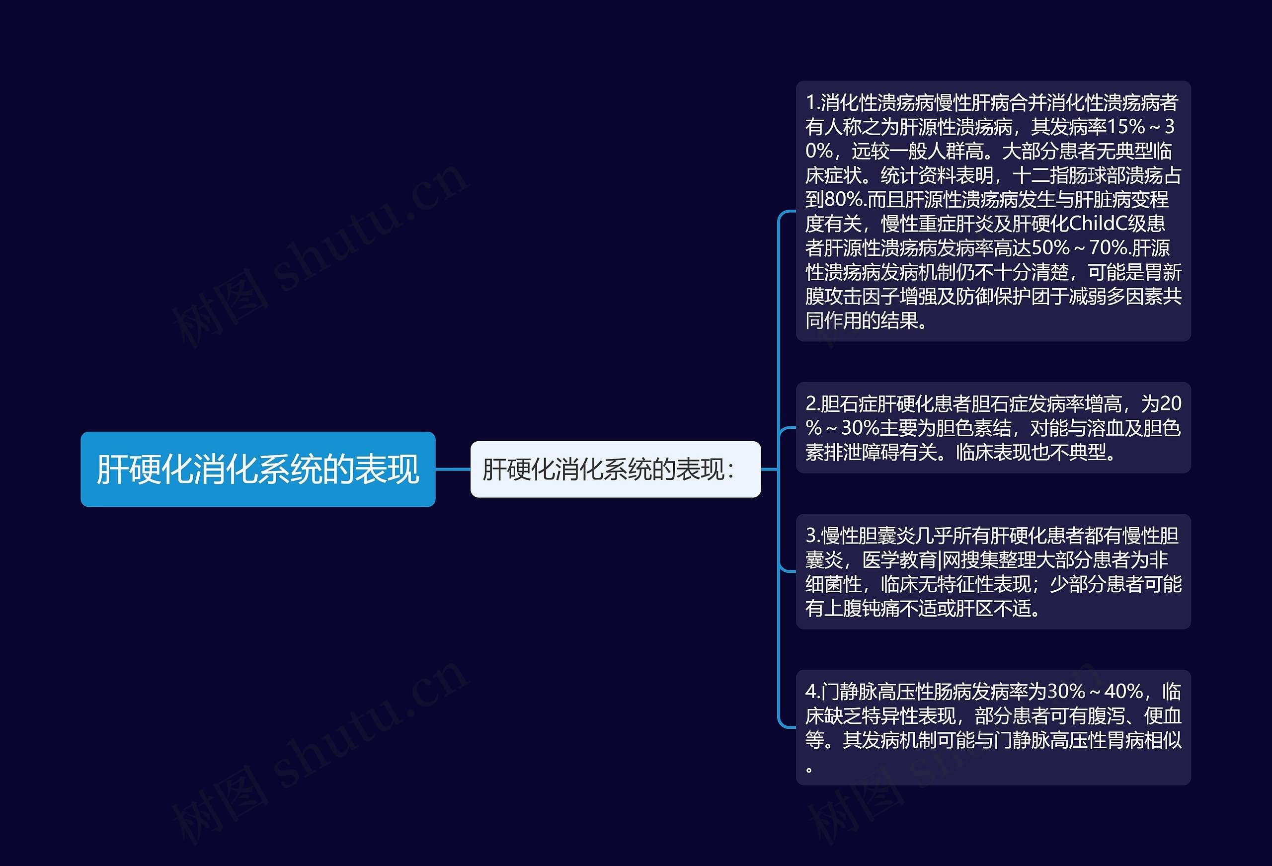 肝硬化消化系统的表现: 1.消化性溃疡病慢性肝病合并消化性溃疡病者有人称之为肝源性溃疡病,其发病率15%~30%,远较一般人群高。大部分患者无典型临床症状。