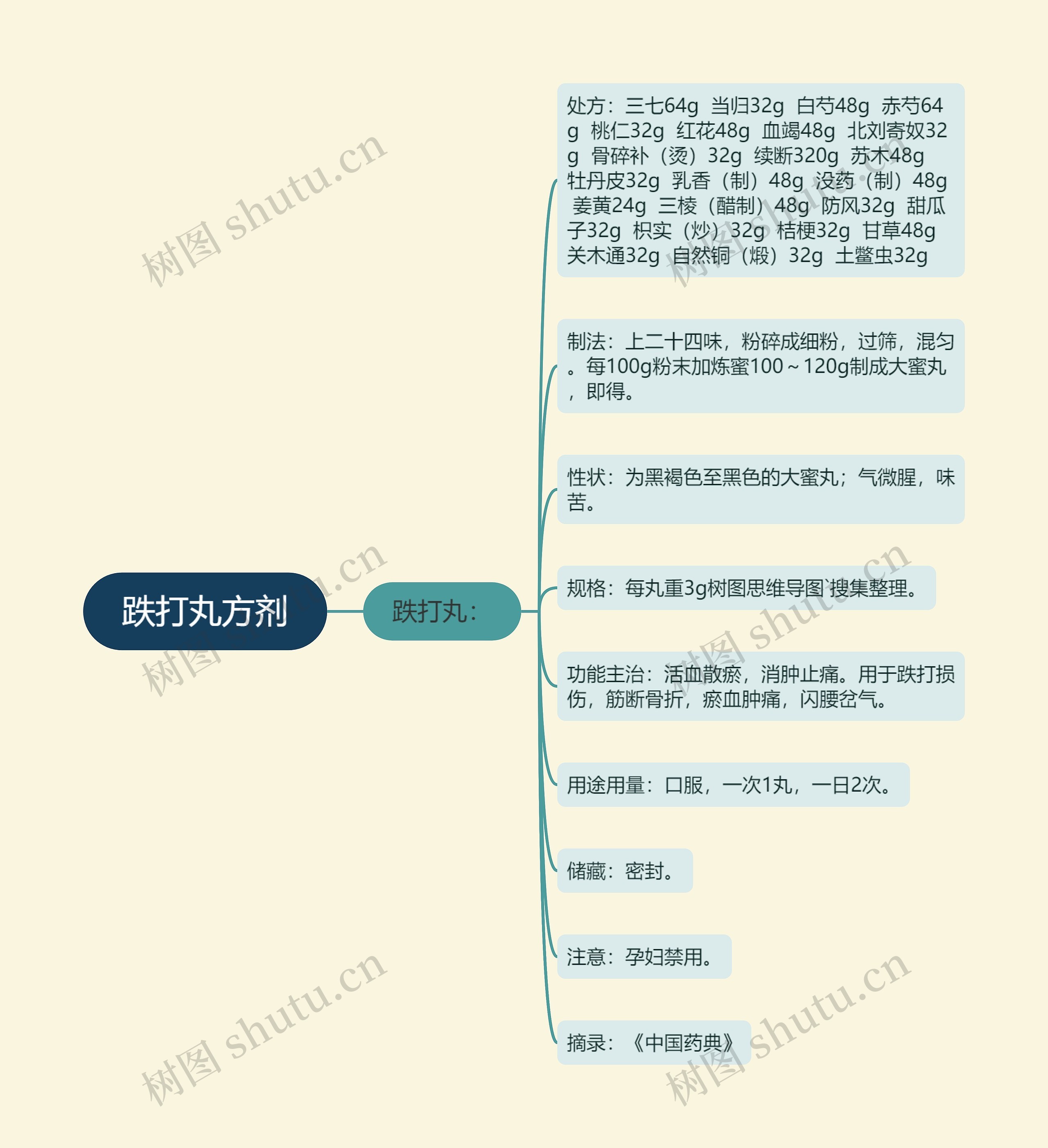 树图思维导图提供《跌打丸方剂》在线思维导图免费制作,点击“编辑”按钮,可对《跌打丸方剂》进行在线思维导图编辑,本思维导图属于思维导图模板主题,文件编号是:da691cb254c721bc8bfe97800bbf9cf5