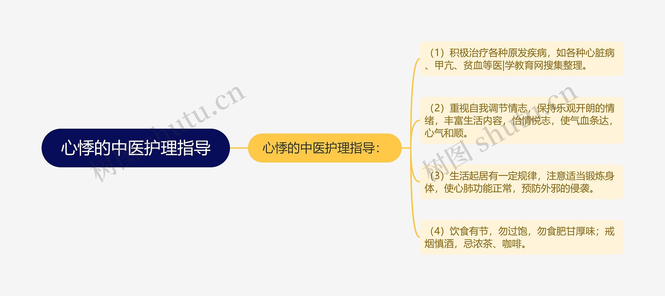 树图思维导图提供《心悸的中医护理指导》在线思维导图免费制作,点击“编辑”按钮,可对《心悸的中医护理指导》进行在线思维导图编辑,本思维导图属于思维导图模板主题,文件编号是:03ac8ddb74d902242078645a8b2ab685