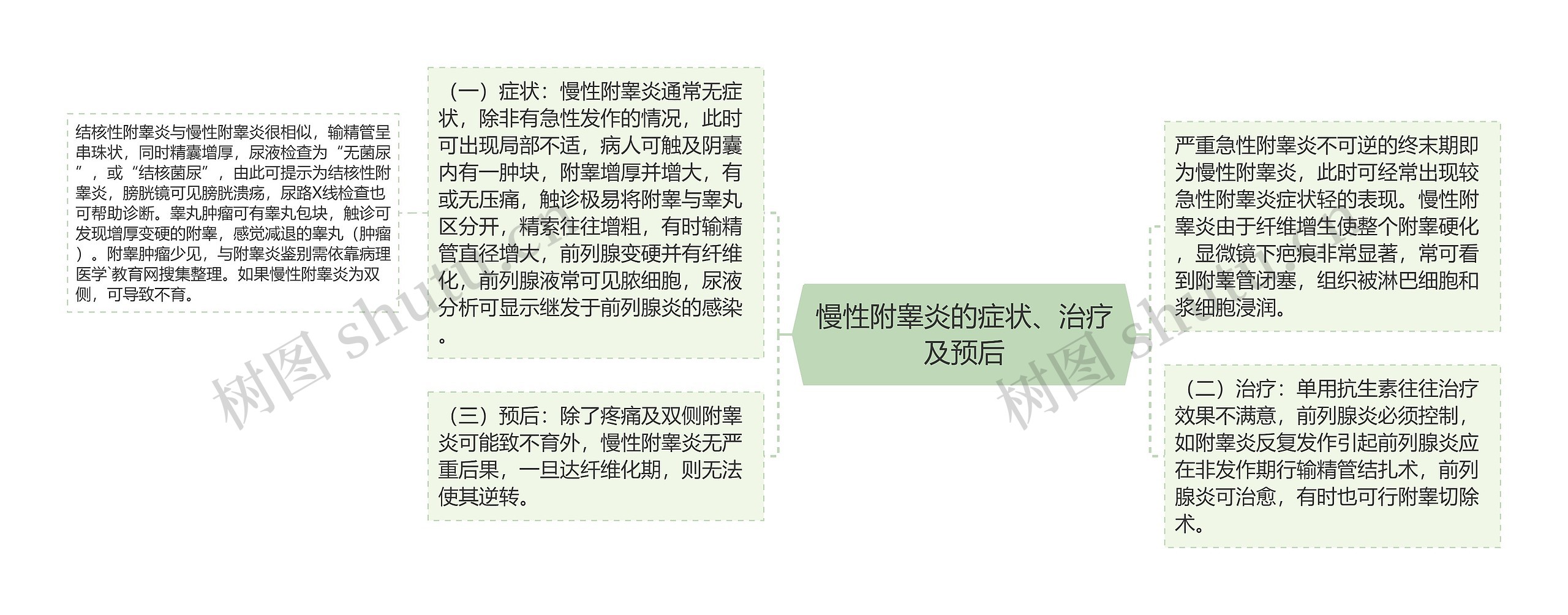 树图思维导图提供《慢性附睾炎的症状、治疗及预后》在线思维导图免费制作,点击“编辑”按钮,可对《慢性附睾炎的症状、治疗及预后》进行在线思维导图编辑,本思维导图属于思维导图模板主题,文件编号是:1a11a8b4b0e91ea3e49163ef6d9888d9