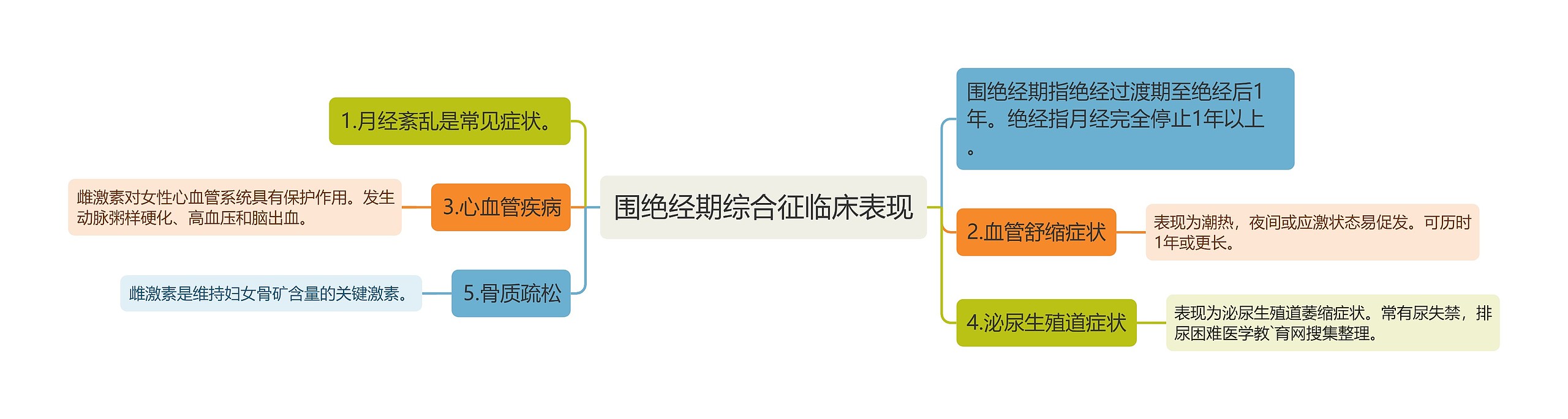 围绝经期指绝经过渡期至绝经后1年。绝经指月经完全停止1年以上。 1.月经紊乱 是常见症状。 2.血管舒缩症状 表现为潮热,夜间或应激状态易促发。可历时1年或更长。 3.心血管疾病 雌激素对女性心血管系统具有保护作用。发生动脉粥样硬化、高血压和脑出血。 4.泌尿生殖道症状 表现为泌尿生殖道萎缩症状。